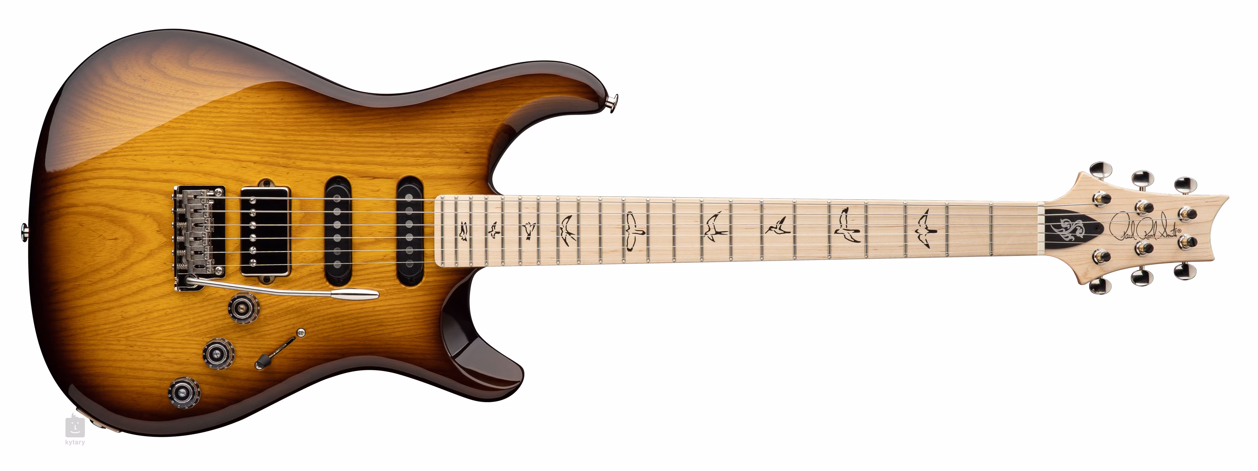 Der ergonomisch geformte Korpus der Fiore Sunflower Gitarre ist aus Sumpfesche gefertigt. Der Korpus ist mit Nitrolack überzogen und auf Hochglanz poliert. Der geschraubte Ahornhals und das Griffbrett sind aus Ahorn. Zweiundzwanzig Bünde und Positionsmarkierungen in Form von Vogelsilhouetten teilen das Ahorn-Griffbrett. Spieler, die an S/T-Modelle gewöhnt sind, werden mit der Mensa-Länge von 648 mm zufrieden sein.