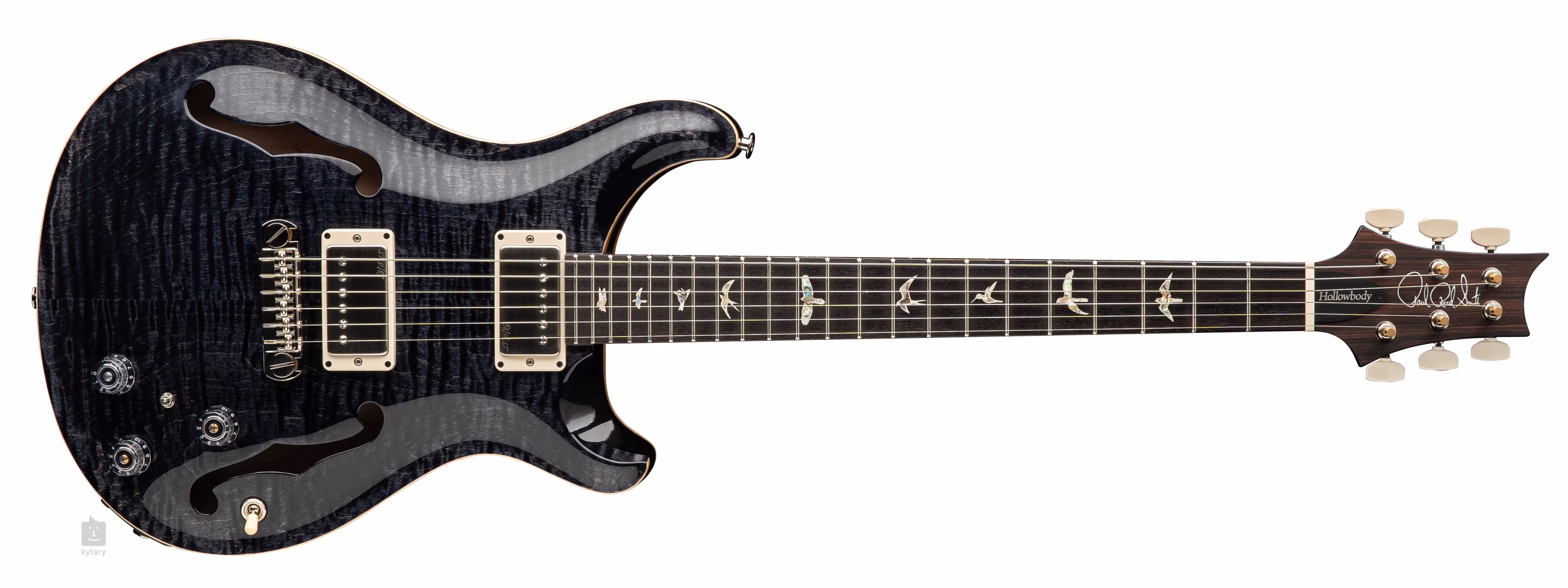 Die Hollowbody II Piezo Gray Black ist eine Gitarre mit einem resonanten Korpus, der aus Ahorn vorne und hinten und Mahagonizargen besteht. Der Korpus ist mit glänzendem Nitrolack überzogen. Ein einteiliger Mahagoni-Hals mit Pattern-Profil ist auf ein Palisander-Griffbrett mit zweiundzwanzig Bünden geleimt. Die Orientierung auf dem Griffbrett wird durch die charakteristischen PRS-Positionsmarker in Form von perlmuttfarbenen Vogelsilhouetten erleichtert.