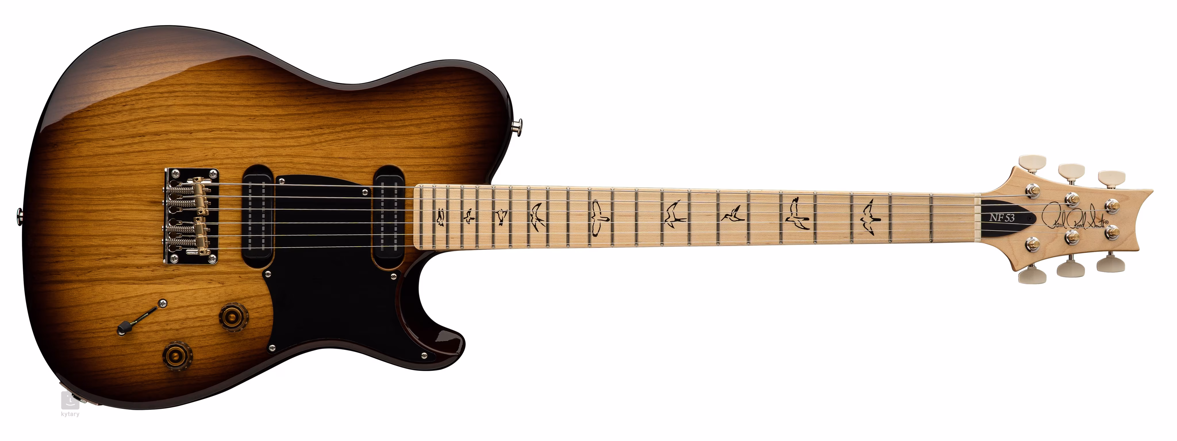 Der Korpus der NF 53 McCarty Tobacco Sunburst Gitarre ist aus Sumpfesche gefertigt. Für die Bespielbarkeit sorgt der angeschraubte Ahornhals mit Pattern 53-Profil, das Aspekte von Pattern Vintage- und Pattern Regular-Profilen bietet und am Nullbund etwas schmaler ist als der übliche PRS-Standard. Positionsmarkierungen in Form von Vogelsilhouetten erleichtern die Orientierung auf dem Ahorngriffbrett.
