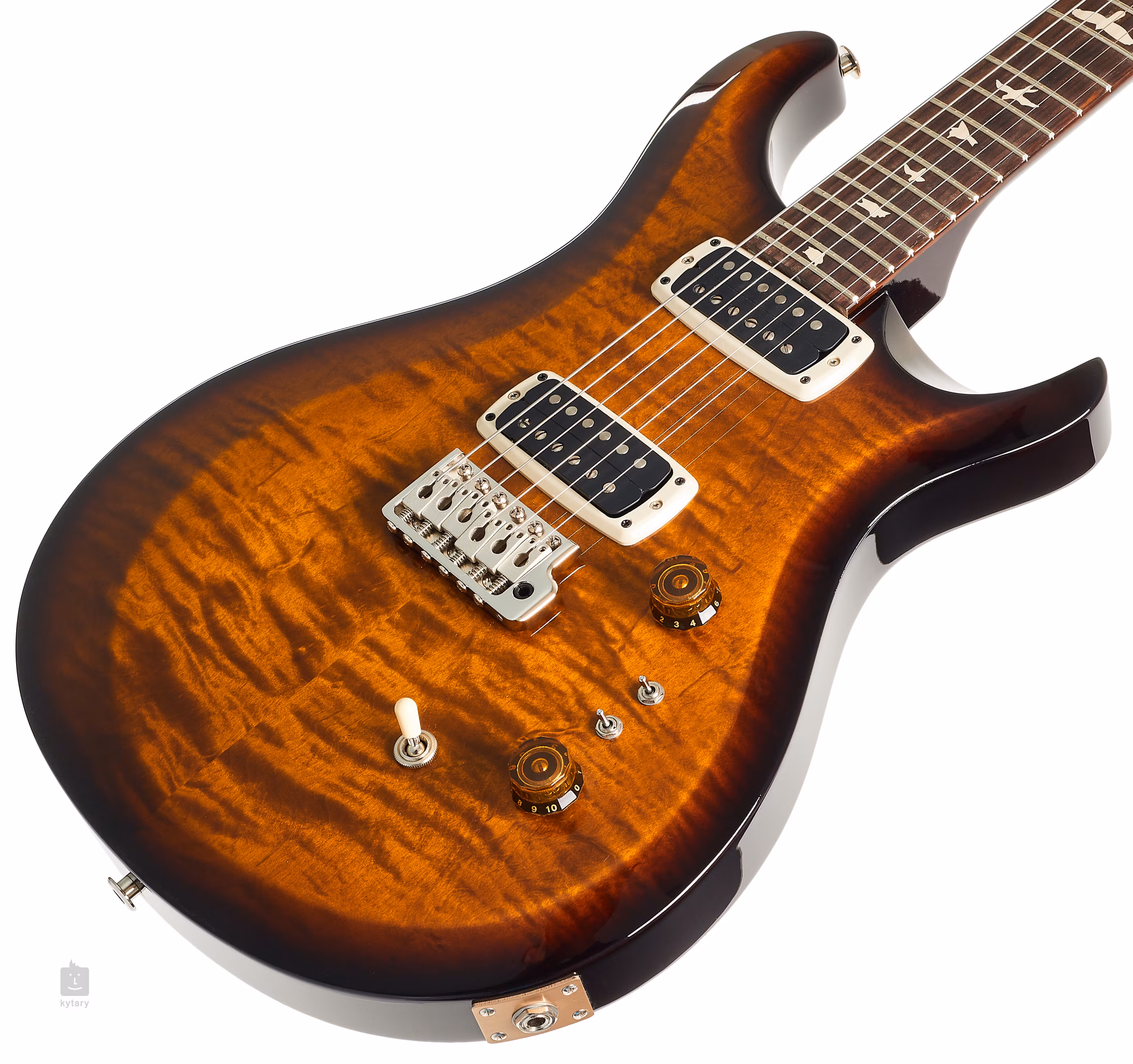 Der Mahagonikorpus der S2 Custom 24-08 Black Amber mit dem charakteristischen PRS-Double-Cut-Design ist mit einer edlen geflammten Ahorndecke und einer glänzenden Lackierung versehen. Deutlich abgeschrägte Korpuskanten fördern die allgemeine Spielergonomie. Ein Palisander-Griffbrett mit vierundzwanzig Bünden ist auf den Mahagoni-Hals mit Pattern Thin-Profil geleimt. Positionsmarkierungen in Form von Vogelsilhouetten aus Perlmutt erleichtern die Orientierung auf dem Griffbrett.