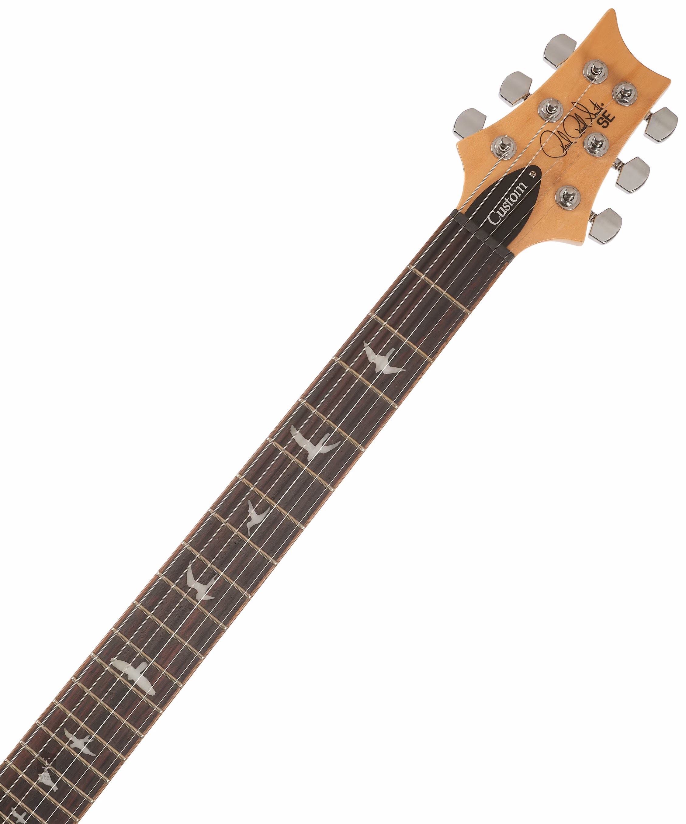 Der Mahagoni-Korpus der SE Custom 24-08 Turquiose ist mit einer Ahorndecke und einem schicken Furnier aus geflammtem Ahorn verziert. Das Shallow Violin Carve bringt die Spielqualität des Instruments näher an die teureren Modelle der American Core Series. Ein Palisandergriffbrett mit vierundzwanzig Bünden ist auf einen Ahornhals mit Wide Thin-Profil geleimt. Positionsmarkierungen in Form von Vogel-Silhouetten aus Perlmutt erleichtern die Orientierung auf dem Griffbrett.