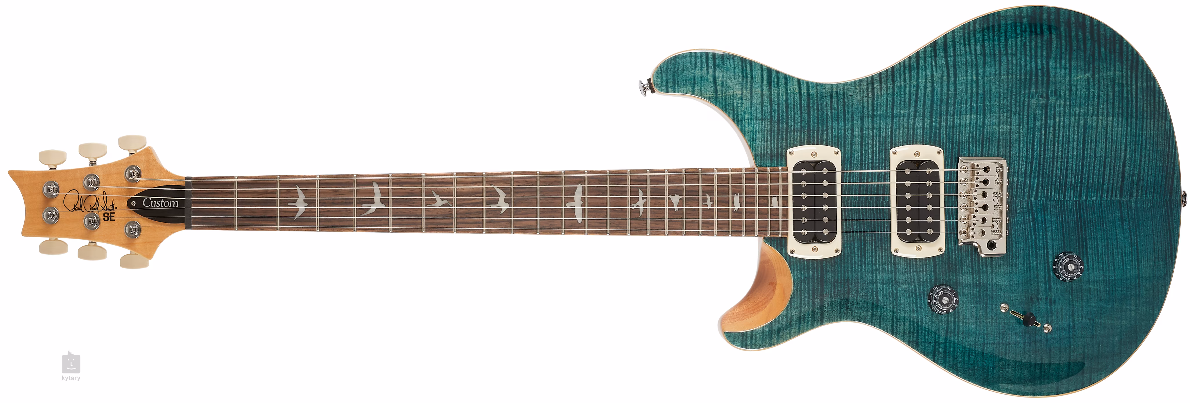 Der Mahagonikorpus der Linkshändergitarre SE Custom 24 LH Slate Blue 2026 wird durch eine Ahorn-Decke und eine effektvolle Furnieroberfläche aus geflammtem Ahorn verziert. Der Shallow Violin Carve-Ausschnitt bringt die Spieleigenschaften des Instruments qualitativ näher an die teureren amerikanischen Modelle der Core-Serie heran. Der Ahornhals mit Wide Thin-Profil ist mit einem Palisandergriffbrett mit 24 Bünden versehen. Die Orientierung auf dem Griffbrett erleichtern Positionsmarkierungen in Form von Vogelsilhouetten.