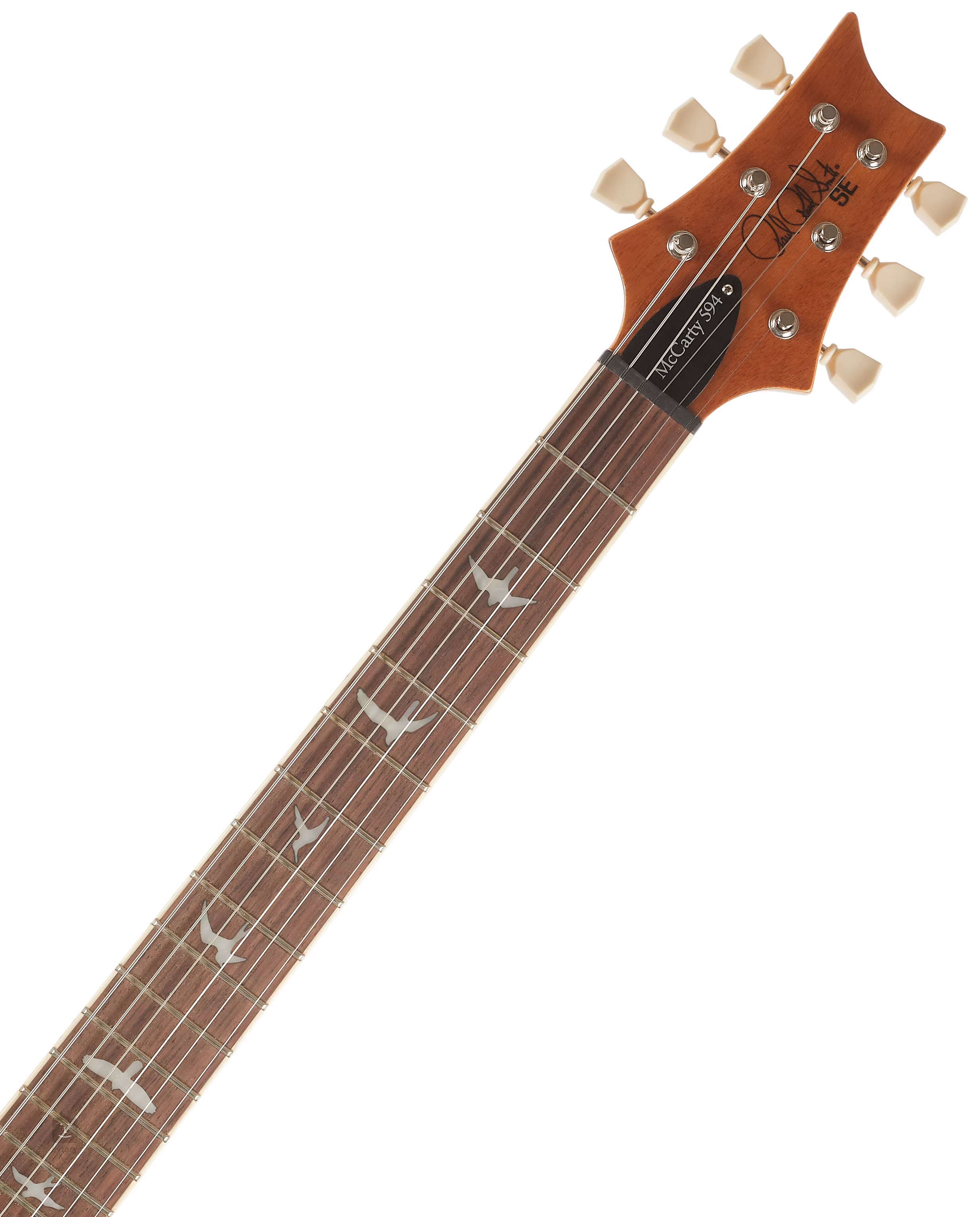 Der Mahagonikorpus der SE McCarty 594 Charcoal Double-Cut-Gitarre ist mit einer Ahorndecke und geflammtem Ahornfurnier verziert. Das Shallow Violin Carve bringt die Qualität der Spieleigenschaften des Instruments näher an die teureren Modelle der American Core Series. Der Mahagoni-Hals mit Pattern-Vintage-Profil ist mit einem Palisander-Griffbrett mit zweiundzwanzig Bünden verleimt. Die kürzere Mensur der Gitarre (625 mm) kommt natürlich in der Modellbezeichnung McCarty 594 (24,594 Zoll) zum Ausdruck. Positionsmarkierungen in Form von Vogelsilhouetten erleichtern die Orientierung auf dem Griffbrett.