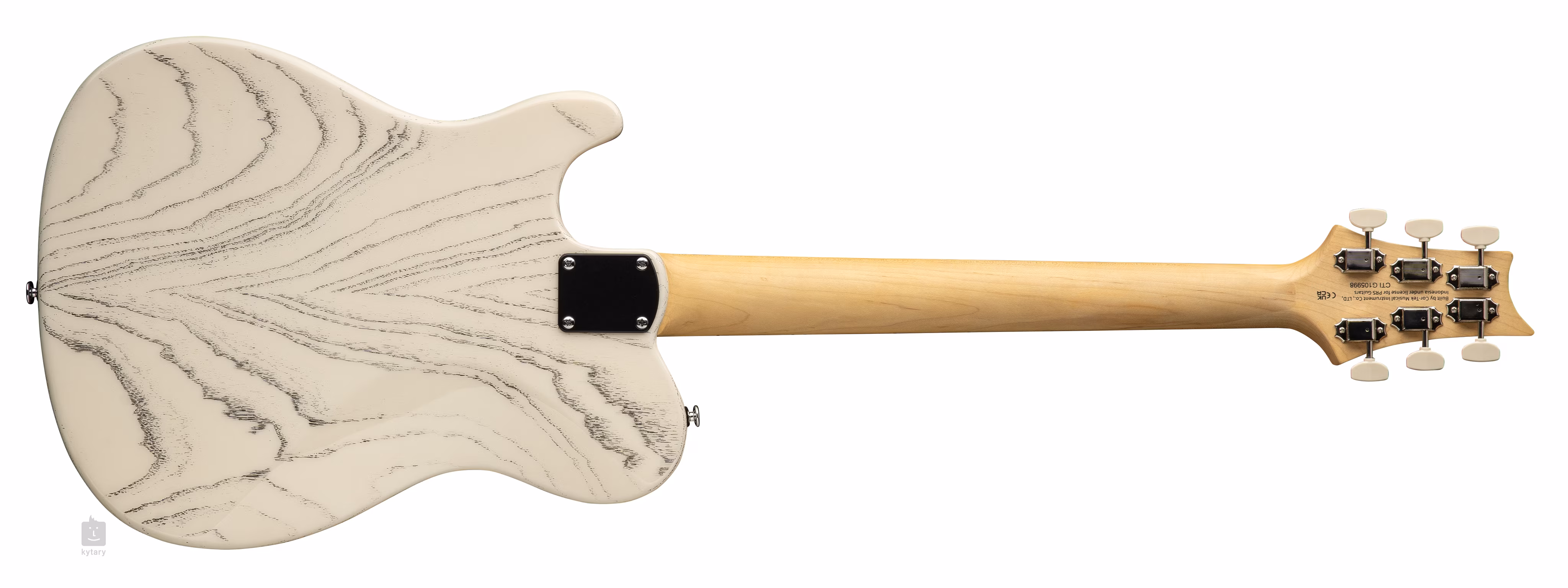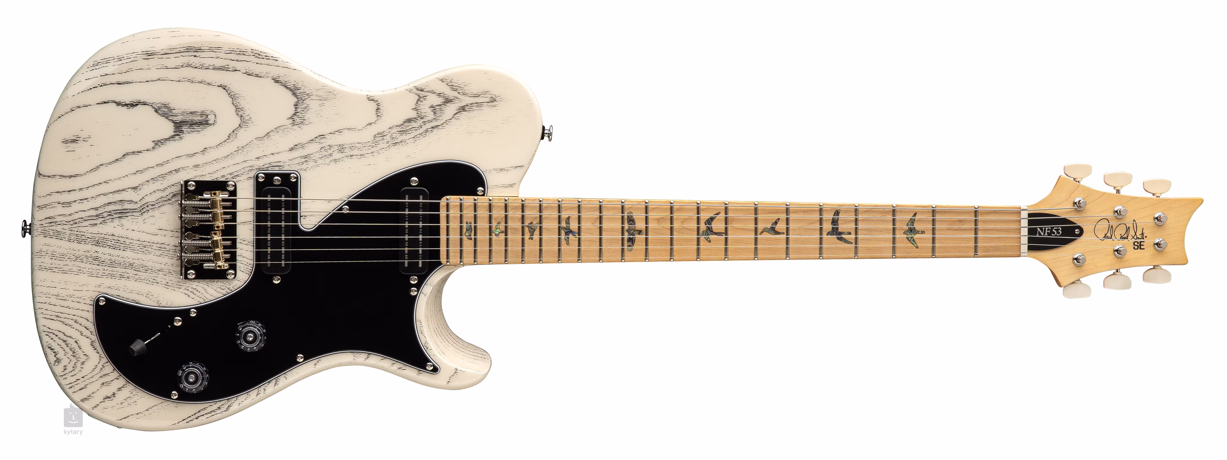 Der Korpus der SE NF 53 White Doghair E-Gitarre ist aus Sumpfesche gefertigt. Für Spielkomfort sorgt der angeschraubte Ahornhals, der am Nullbund etwas schmaler ist als bei der Standard-PRS. Positionsmarkierungen in Form von Vogelsilhouetten auf dem Ahorngriffbrett erleichtern die Orientierung.