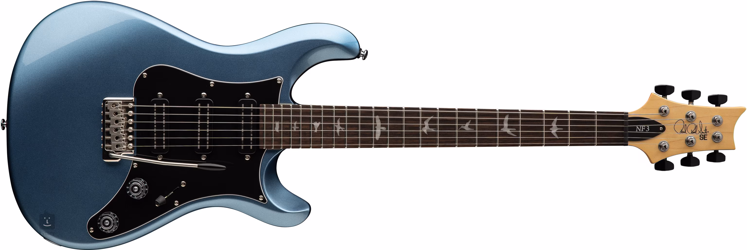 Der Korpus der SE NF3 RW Ice Blue Metallic 2026 ist aus Pappelholz gefertigt. Der geschraubte Ahornhals mit Wide Thin-Profil ist mit einem Palisandergriffbrett mit 22 Bünden versehen. Die Orientierung auf dem Griffbrett erleichtern Positionsmarkierungen in Form von Vogelsilhouetten.