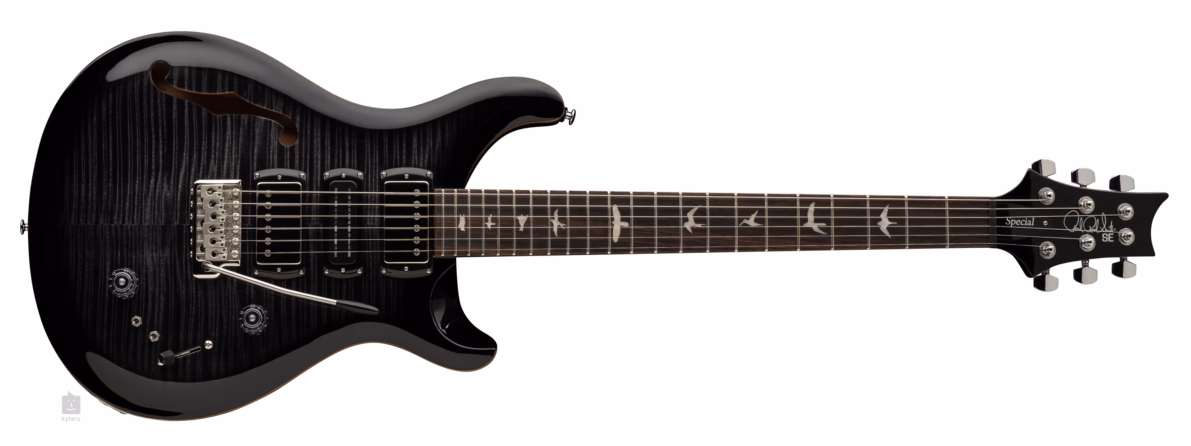 Der PRS SE Special Semi-Hollow Charcoal Burst Mahagoni-Korpus mit einfachem F-Cutaway ist mit einer Ahorndecke und einer ausgefallenen geflammten Ahornfurnierdecke ausgestattet. Das Shallow Violin Carve bringt die Spielqualität des Instruments näher an die teureren Modelle der American Core Series. Ein Palisandergriffbrett mit zweiundzwanzig Bünden ist auf einen Ahornhals mit Wide Thin-Profil geleimt. Positionsmarkierungen in Form von Vogelsilhouetten erleichtern die Orientierung auf dem Griffbrett.
