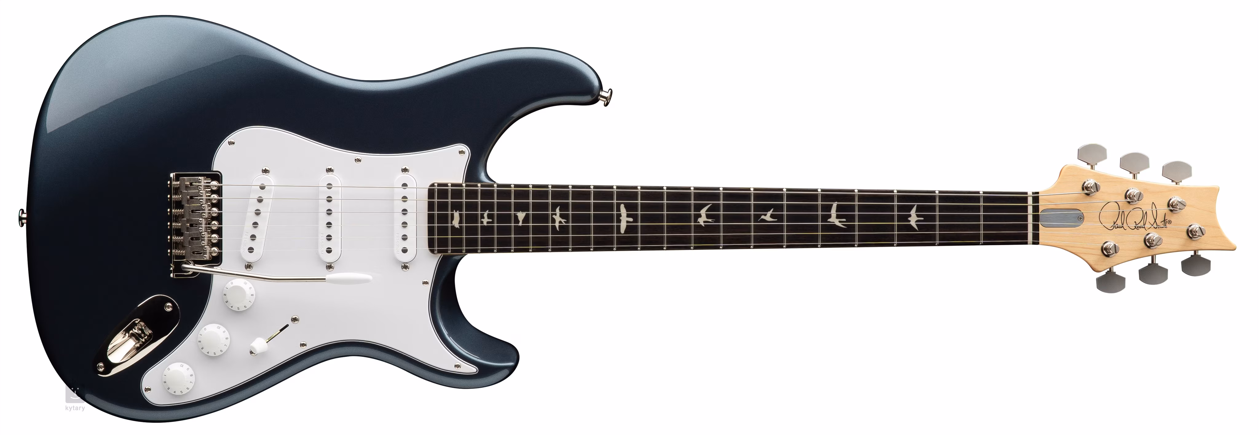 Die Stimmstabilität wird durch die Befestigung der Saiten an der arretierbaren Vintage-Mechanik und das Stahltremolo gewährleistet, das mit PRS-Elementen in Form eines Tremolohebels und Gen III-Schrauben (Messerschneide) angereichert ist. Zu den weiteren Besonderheiten des Instruments gehören eine Kopfplatte mit dem für PRS typischen invertierten Design, ein Griffbrett aus Knochen oder eine signierte Halsplatte. Das stilvolle Finish wird durch ein weißes Schlagbrett akzentuiert.