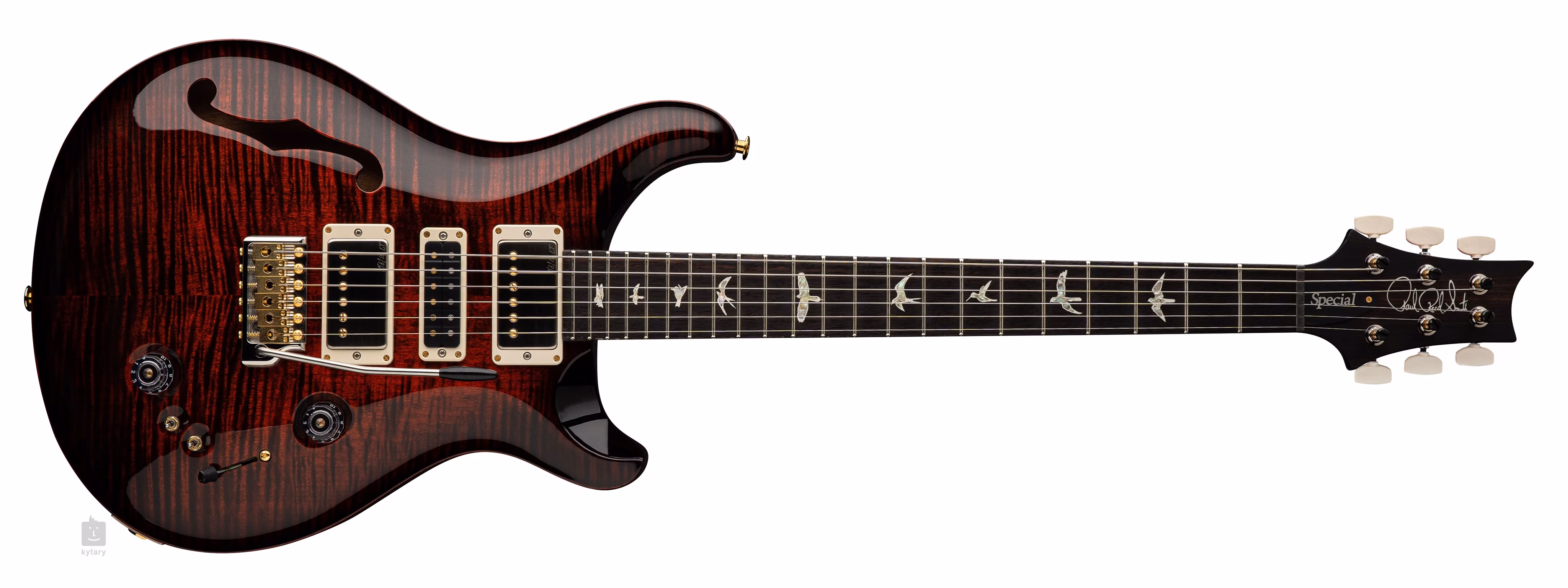 Die Special Semi-Hollow Modellreihe bietet die ergonomische Korpusform der PRS E-Gitarren mit zwei Cutaways in Kombination mit einer Semi-Hollow-Konstruktion. Der Mahagonikorpus der Special Semi-Hollow Fire Smokeburst Gitarre ist mit einer fein gemaserten Ahorndecke versehen. Ein Palisander-Griffbrett mit zweiundzwanzig Bünden ist auf den Mahagoni-Hals mit Pattern-Profil geleimt. Die Orientierung auf dem Griffbrett wird durch die PRS-typischen Positionsmarker in Form von perlmuttfarbenen Vogelsilhouetten erleichtert.