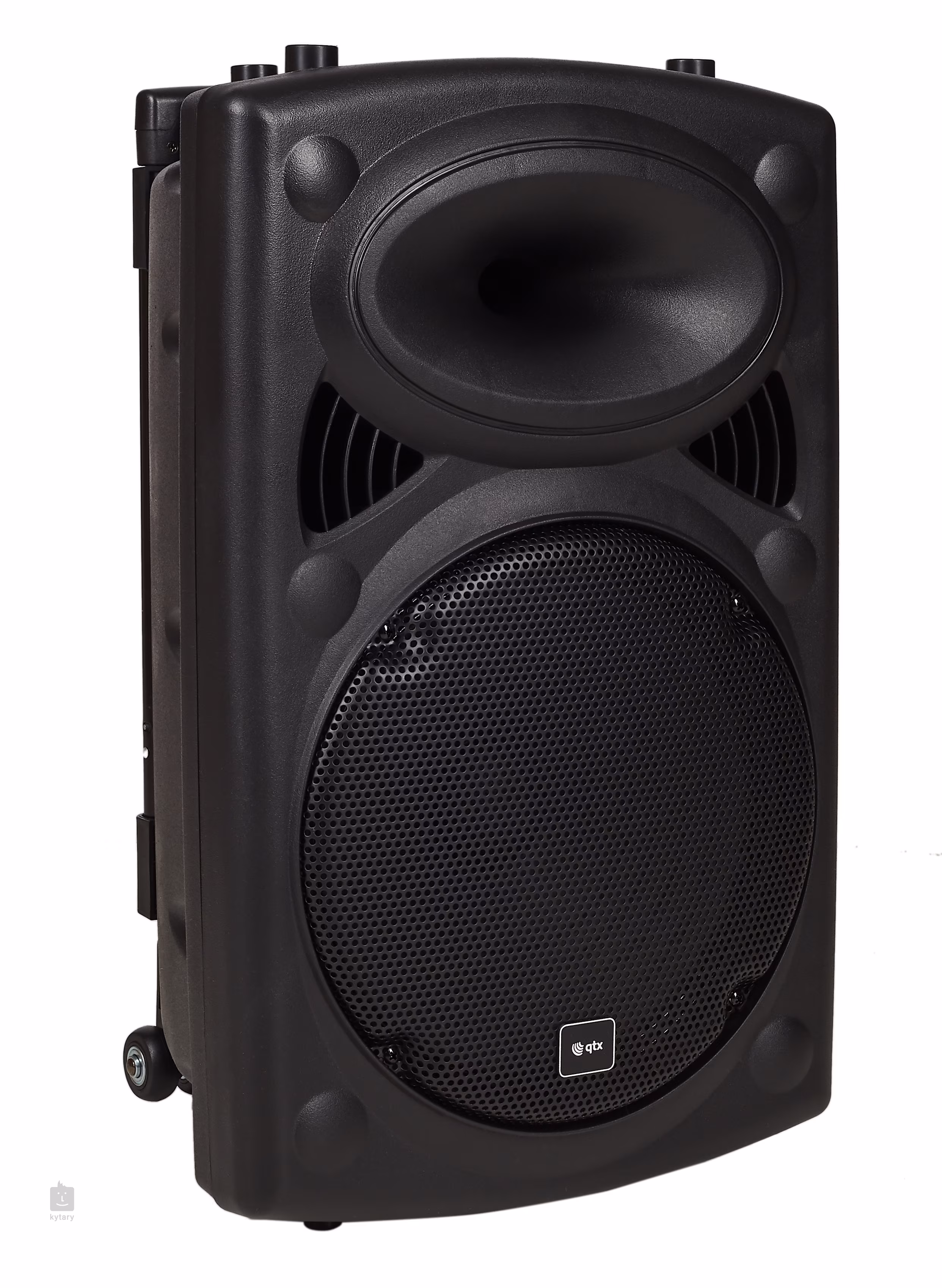 Tragbares 12"-Lautsprechersystem der QR-Serie mit integriertem Verstärker mit 50 + 50 W RMS-Ausgangsleistung (LF + HF), der über das Stromnetz oder einen internen Akku (bis zu 8 Stunden Batteriebetrieb) betrieben wird. Beinhaltet 2x drahtlose VHF-Handmikrofone (Frequenz 174,1MHz + 175,0MHz), eingebauter Empfänger und Verstärker auf der Rückseite mit Bedienelementen (Lautstärkeregler, Echo-Effekt, Bass- und Höhenkorrektur und Pegelregler für drahtlose Mikrofoneingänge), 2 Mikrofoneingänge mit Echo-Effekt. Eingänge: Line (AUX) / USB / SD. Einziehbarer Griff und Rollen für einfache Handhabung und Transport. Stromversorgung: extern - 220/240V AC, 50/60Hz, intern - eingebaute 12V Batterie.