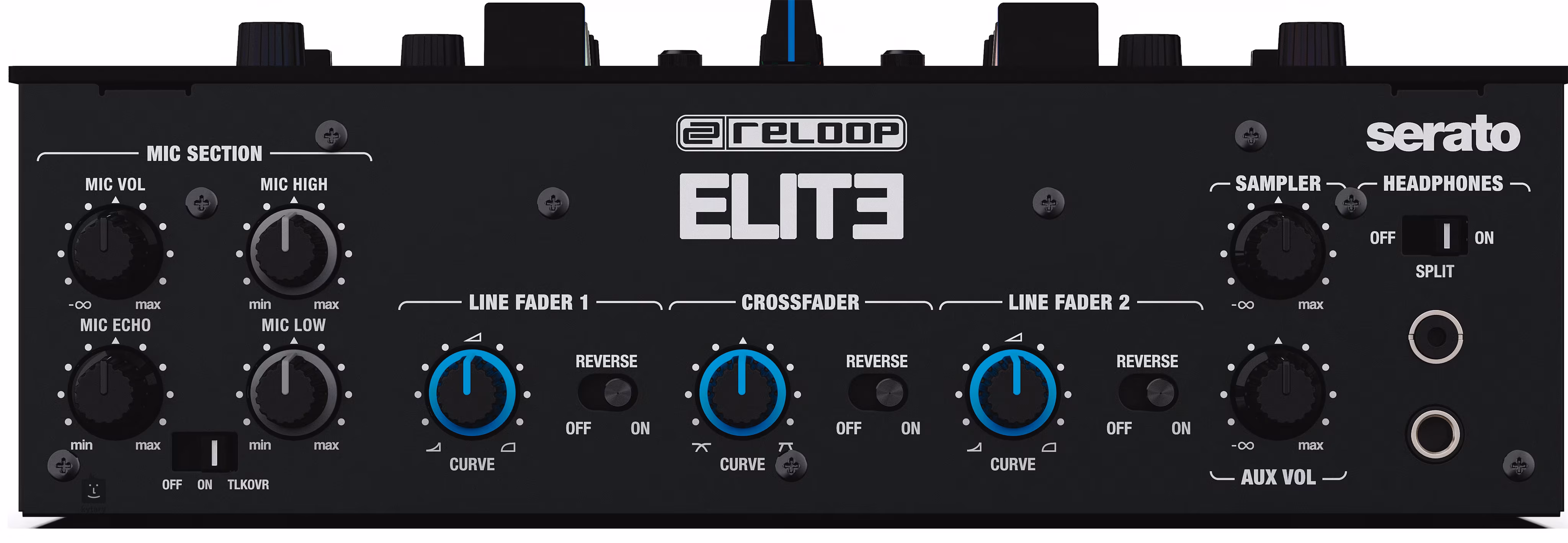 Auf der Vorderseite des Mischers befinden sich vier Potentiometer für die Lautstärkeregelung und die Einstellung des Mikrofoneingangssignals, ein Curve-Regler für die Fader und ein Schalter für den Reverse-Modus. Außerdem gibt es zwei Kopfhörerausgänge, die Sie bei gemeinsamen Auftritten oder DJ-Battles schätzen werden.