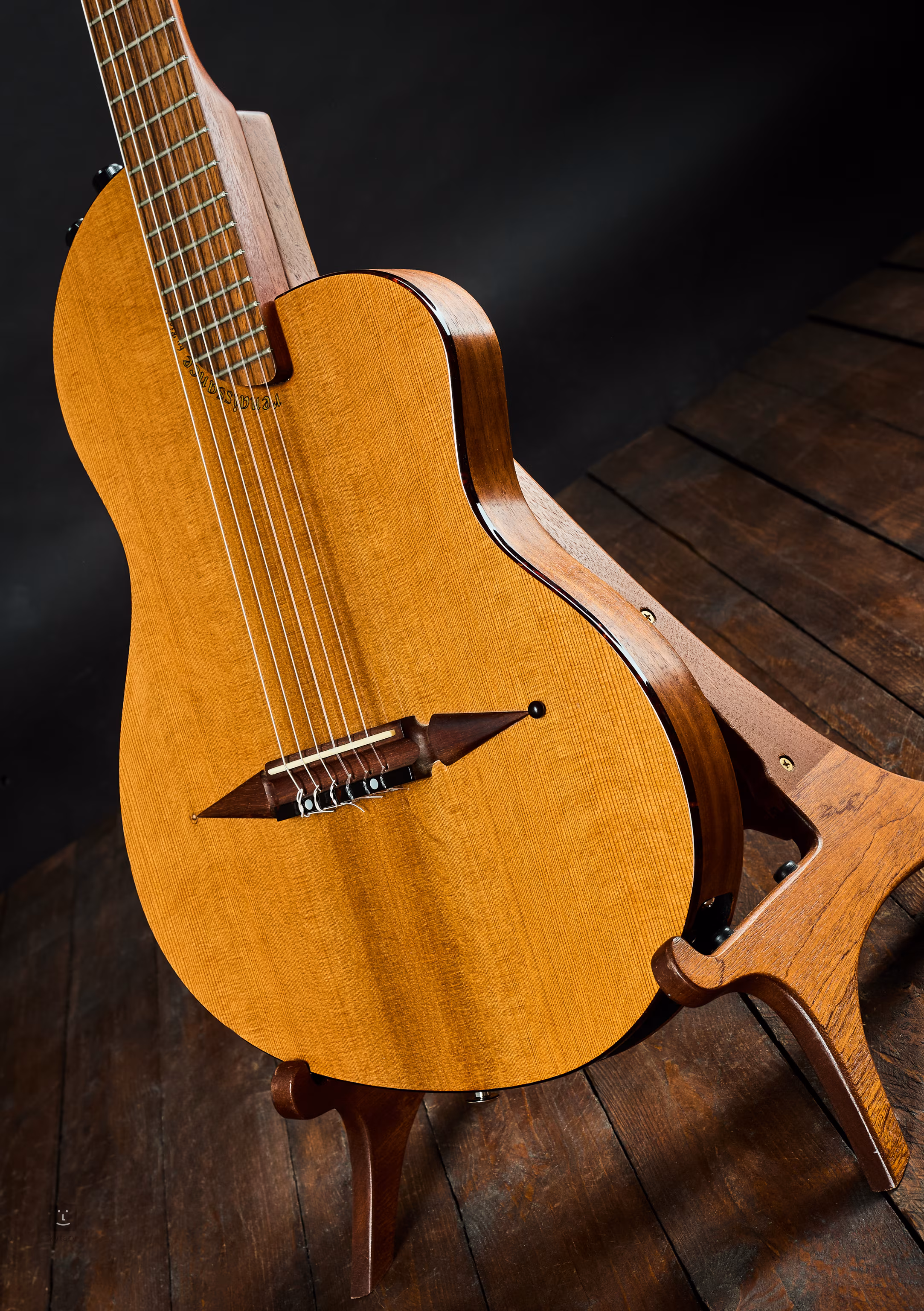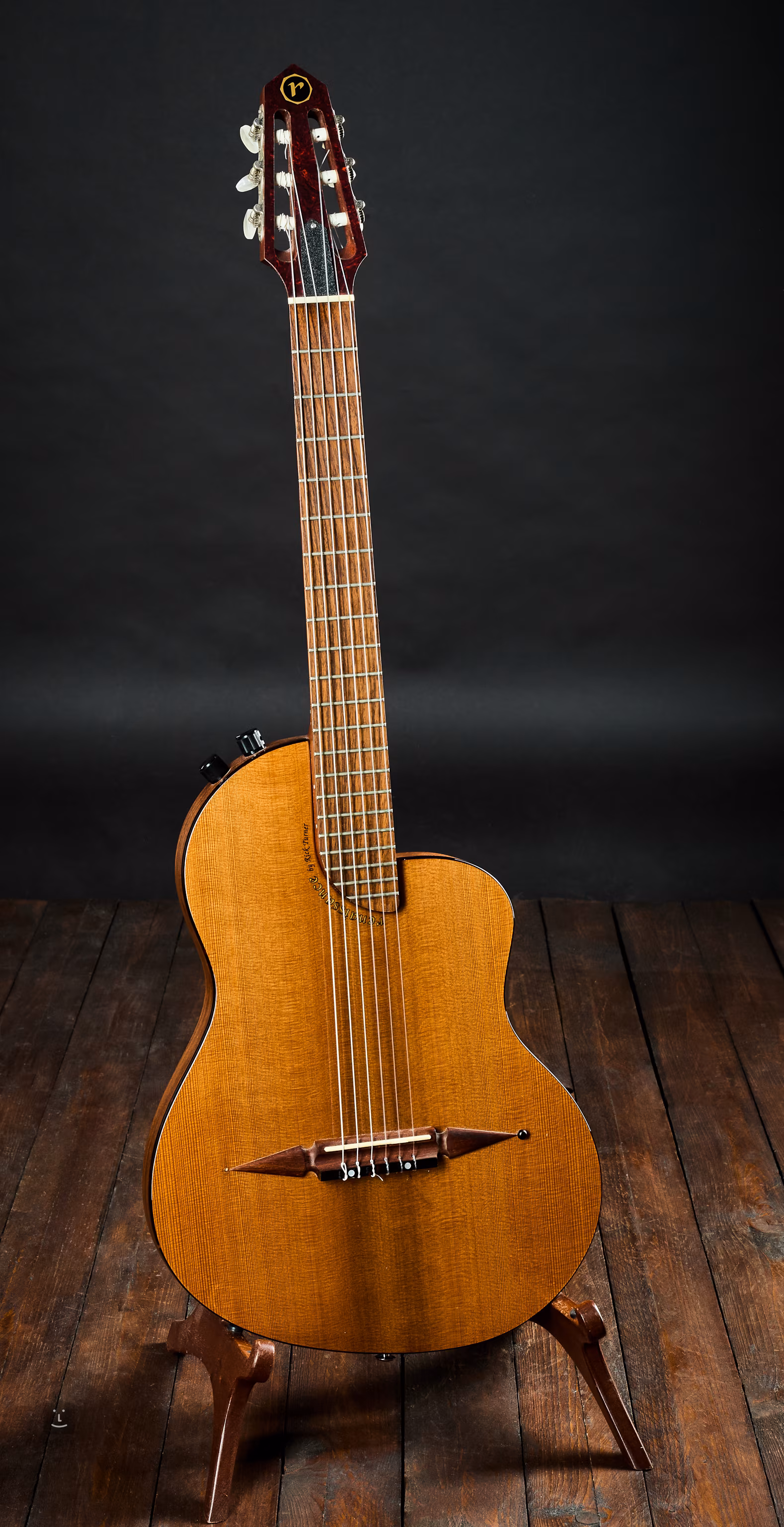 Nylonsaiten; klingt wie ein klassischer Spaniel. Der Piezo wird von zwei 9V-Batterien gespeist. Die Konstruktion ist ultradünn mit dem Halsgelenk am 12. Bund.