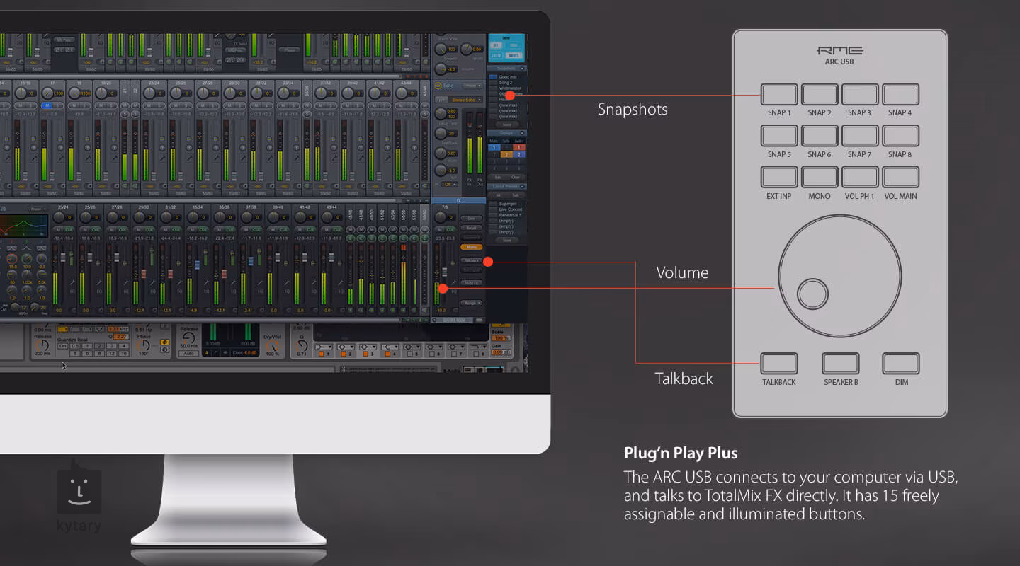 RME ARC USB ist eine Fernsteuerung für den virtuellen Mix von RME Total lMix Soundkarten. Sie bietet einen schnellen Zugriff auf die am häufigsten verwendeten Funktionen und eine breite Palette von Anpassungsmöglichkeiten für den Benutzer.