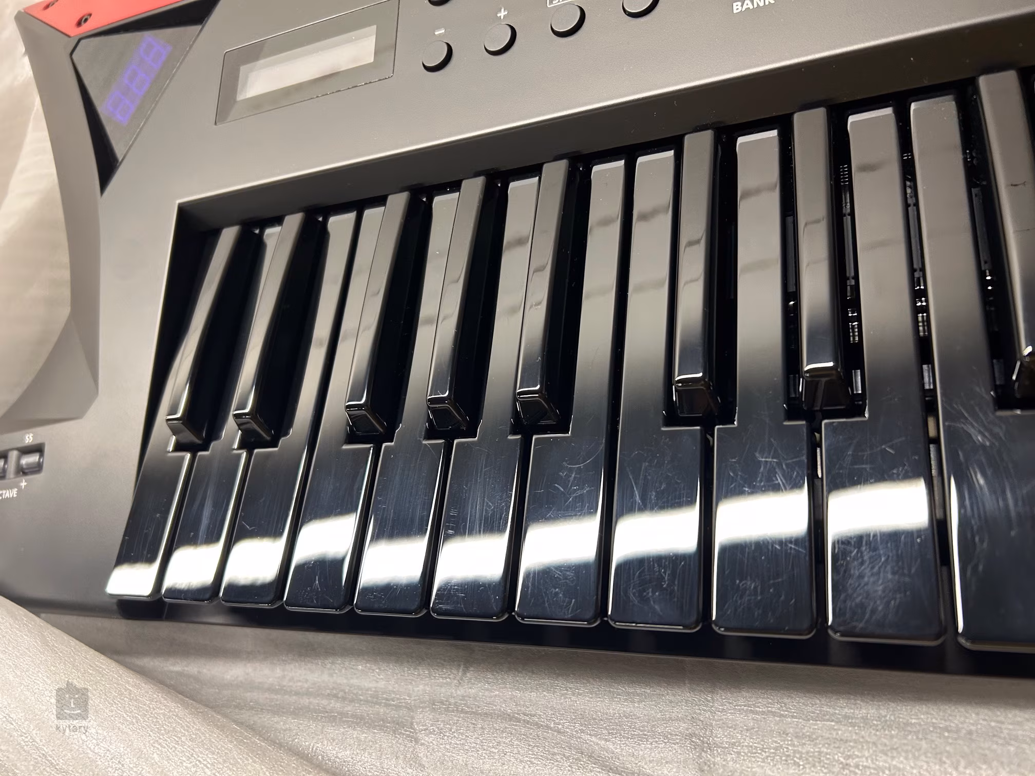 AX-Edge ist ein stylisches Keytar, mit dem Sie auf der Bühne einfach nicht zu übersehen sind. Dieses Gitarrenkeyboard erinnert in seinem Aussehen an einen scharfen Fleischbeil und seine Spitze können Sie zudem ganz nach Ihren Vorstellungen anpassen – ein zusätzliches Teil finden Sie im Lieferumfang. Mit diesem Instrument sind Ihrer Kreativität keine Grenzen gesetzt. Das Herzstück dieses Keyboards sind 320 sorgfältig ausgewählte Sounds, die sich zuverlässig im Mix durchsetzen und den Anforderungen moderner und traditioneller Musikstile entsprechen. Sie können zwischen Bass-Sounds, Flächen und aggressiven Leads wählen. Ihre Lieblingssounds können Sie auch ganz einfach über Tasten aufrufen. Mit der AX-Editor-App können Sie die Sounds drahtlos direkt von Ihrem Smartphone aus anpassen. Selbstverständlich können Sie einzelne Sounds überlagern und die Tastatur aufteilen. Insgesamt stehen vier Parts + ein Vocoder zur Verfügung, der mit anderen Sounds überlagert werden kann. Neben dem Vocoder umfasst das Effekt-Arsenal einen Equalizer, mehrere Chorus- und Reverb-Effekte, IFX-Multieffekte sowie einen Master-Kompressor und einen Equalizer für die professionelle Feinabstimmung des Gesamtsounds. Am Hals befinden sich ein Modulationsstreifen, eine Leiste zur Steuerung der Tonhöhe, Portamento, Hold, Oktav- und Programmumschaltung. Eine Reihe von Bedienelementen kann auch an die spezifischen Bedürfnisse des Spielers angepasst werden. Zur einfachen Orientierung auf der Bühne befinden sich auf dem vorderen Bedienfeld zwei Displays mit Informationen zum Programm. Ein eingebauter Arpeggiator und ein Song-Player sind ebenfalls vorhanden, sodass Sie sich in spannenden Momenten voll und ganz auf das Publikum konzentrieren können und das Spielen dem Instrument überlassen können. Schließlich ist noch die Möglichkeit des Batteriebetriebs (ca. vier Stunden), ein USB-Steckplatz zum Speichern der Einstellungen und Bluetooth MIDI zu erwähnen, über das die Keytar beispielsweise mit Ihrem Telefon kommuniziert.