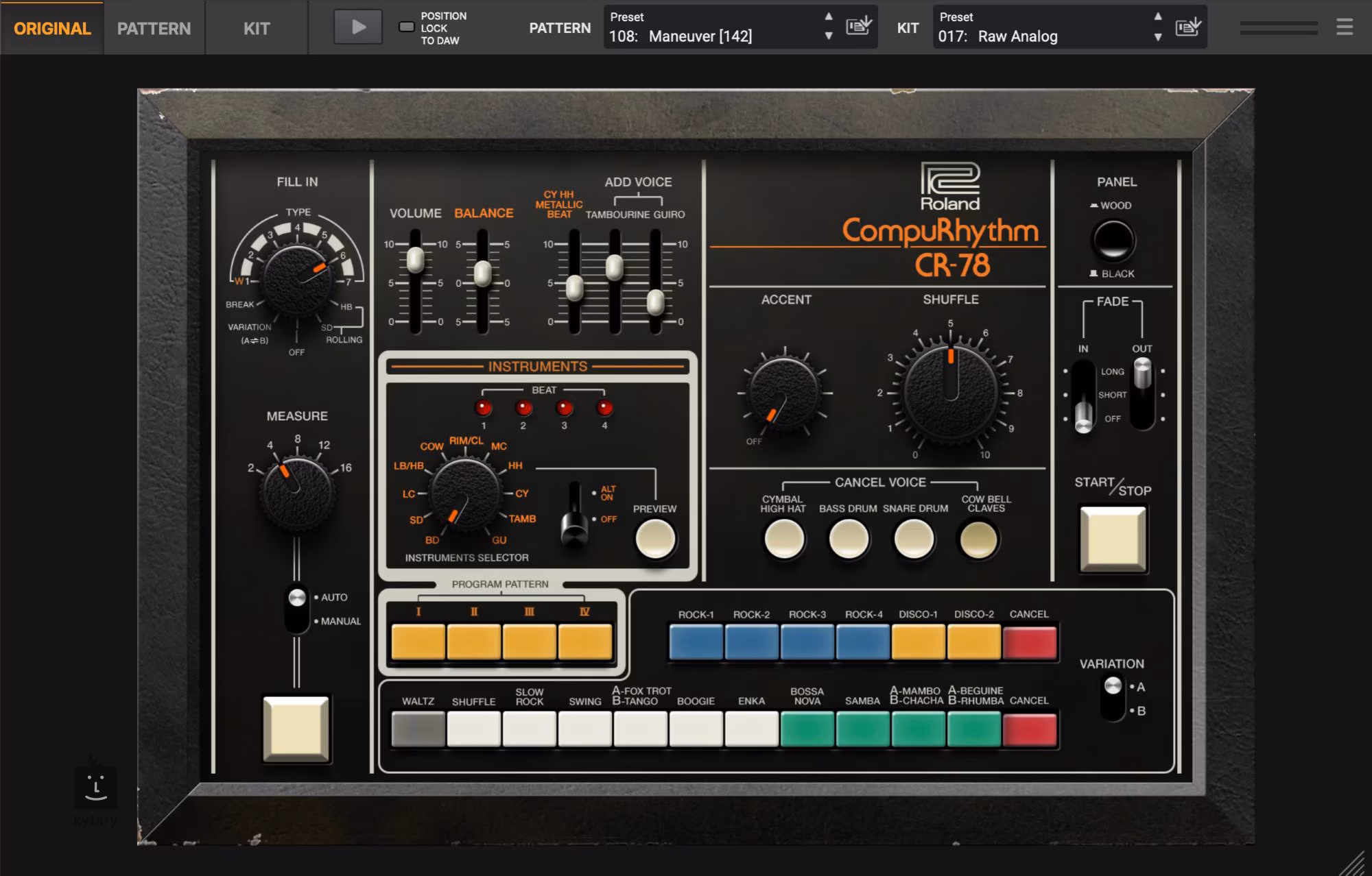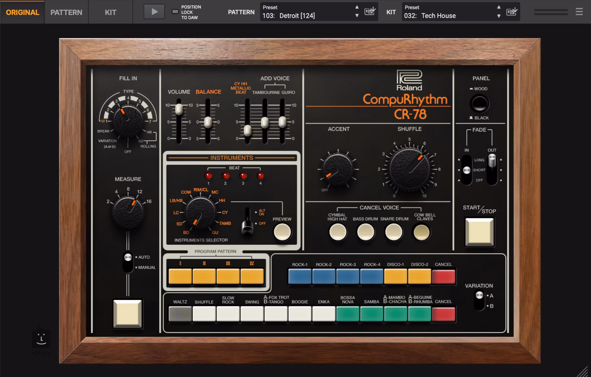 Der Roland CR-78 Software Rhythm Composer ist eine originalgetreue Software-Neuauflage des weltweit ersten programmierbaren Drumcomputers aus dem Jahr 1978. Seine warme Bassdrum, die scharfe Snare und die seidenweichen Becken prägten den Sound von Hits von Künstlern wie Phil Collins, Blondie oder Ultravox. Dank der hochmodernen Analog Circuit Behavior (ACB) -Technologie von Roland können Sie diesen ikonischen, organischen Sound mit seinen charakteristischen Nuancen nun direkt in Ihrer DAW nutzen und Ihren Songs den unvergänglichen analogen Charakter verleihen.