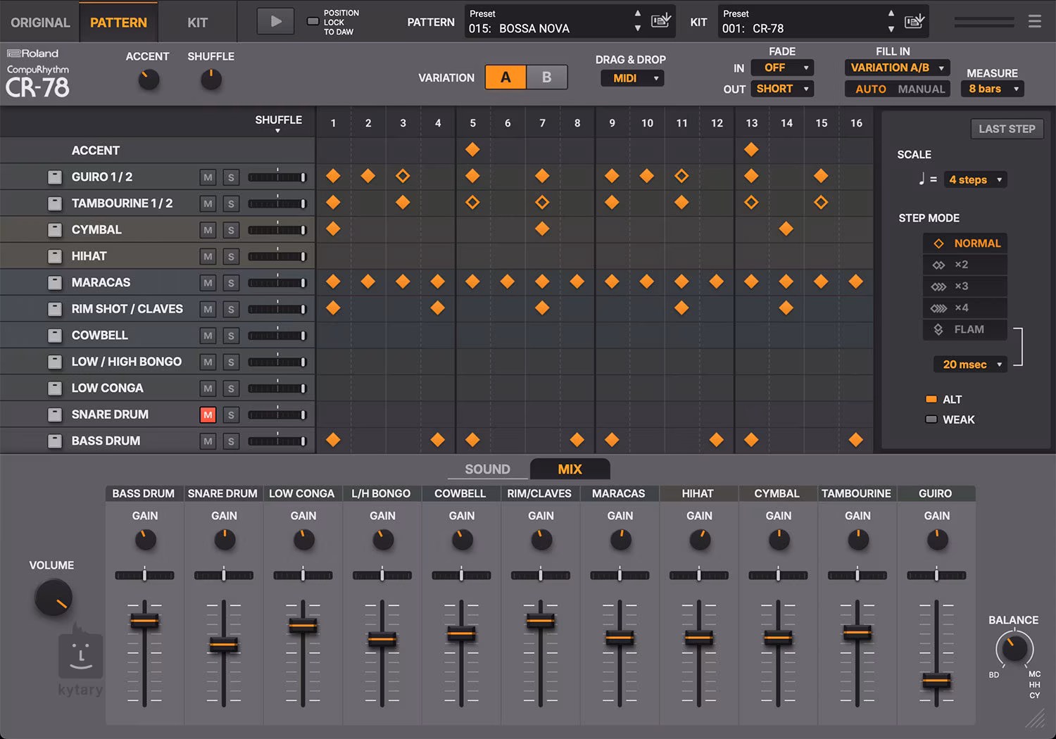 Dieses Plug-in ist jedoch keine bloße Kopie. Es bietet einen fortschrittlichen Step-Sequenzer, der die Möglichkeiten des Originals bei weitem übertrifft. Jede Audiospur ermöglicht die unabhängige Einstellung von Shuffle, Sub-Steps, Flams und feinen Nuancen für die Erstellung lebendiger und dynamischer Rhythmen. Für die detaillierte Klangformung stehen Ihnen Pitch, Decay und Panorama für jedes Instrument zur Verfügung, sowie erweiterte Parameter wie „Attack“ für die Bassdrum oder „Snappy“ für die Snare. Moderne Arbeitsabläufe werden durch die Synchronisation mit dem Projekttempo, die Parameter-Automation und das einfache Drag-and-Drop von MIDI- oder Audiospuren direkt auf die Timeline erleichtert. Das Plug-in ist vollständig kompatibel mit den Formaten AU, VST3 und AAX.