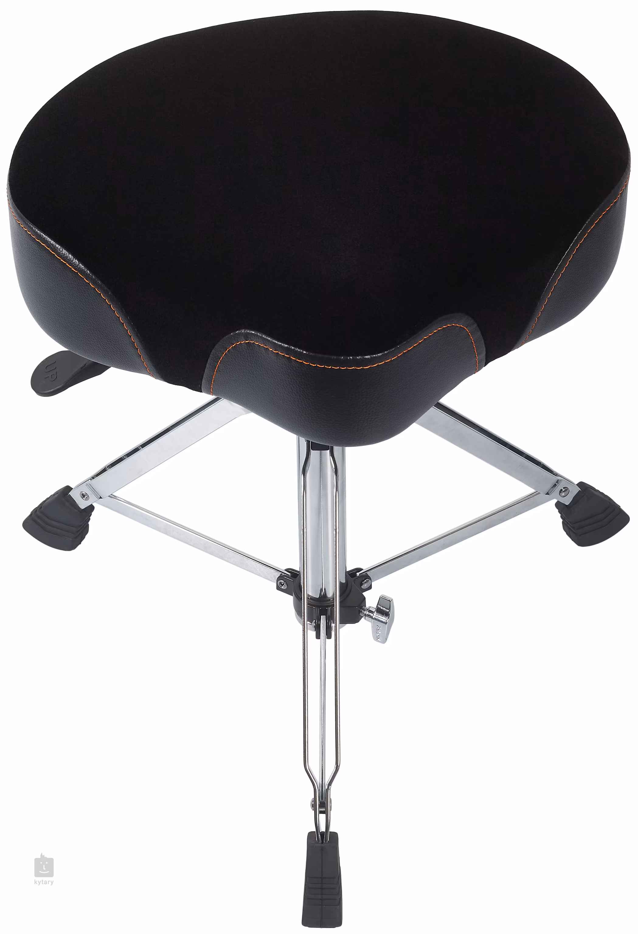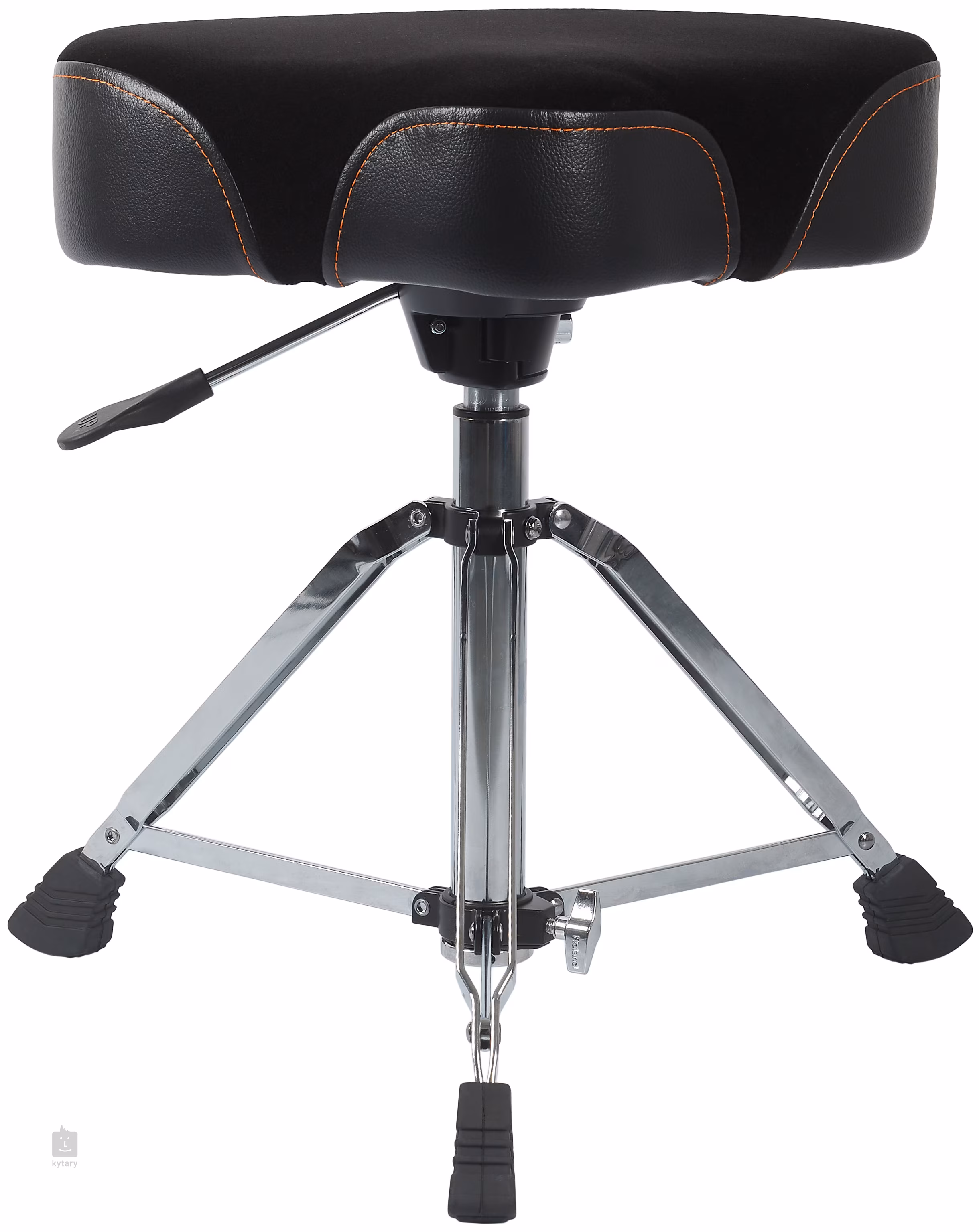 Professioneller Sitz für Schlagzeuger mit hydraulischem System zur Höhenverstellung. Der geformte Sitz ist an den Seiten mit Vinyl überzogen, die Füllung besteht aus Schaumstoff, der den Druck an den am stärksten beanspruchten Stellen mindert, und die atmungsaktive Samtoberfläche (Velours) reduziert die Hitze. Die robuste Konstruktion besteht aus einem Dreibeinstativ mit zwei Beinen, und ein haltbarer Metallträger bietet ein einfaches hydraulisches System zur Höhenverstellung.
