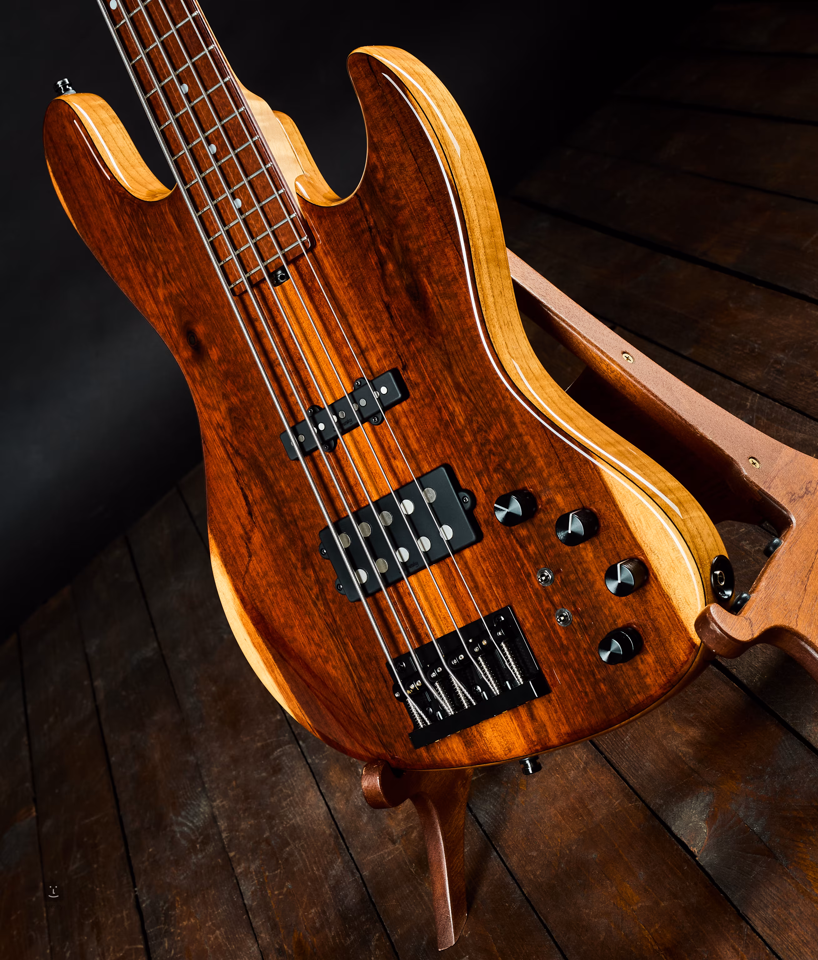 Das exklusive Holz auf dem Griffbrett und am Kopf ist an einigen Stellen rissig, was jedoch weder das Spiel noch den Klang beeinträchtigt. Ansonsten ist die Bassgitarre praktisch wie neu.