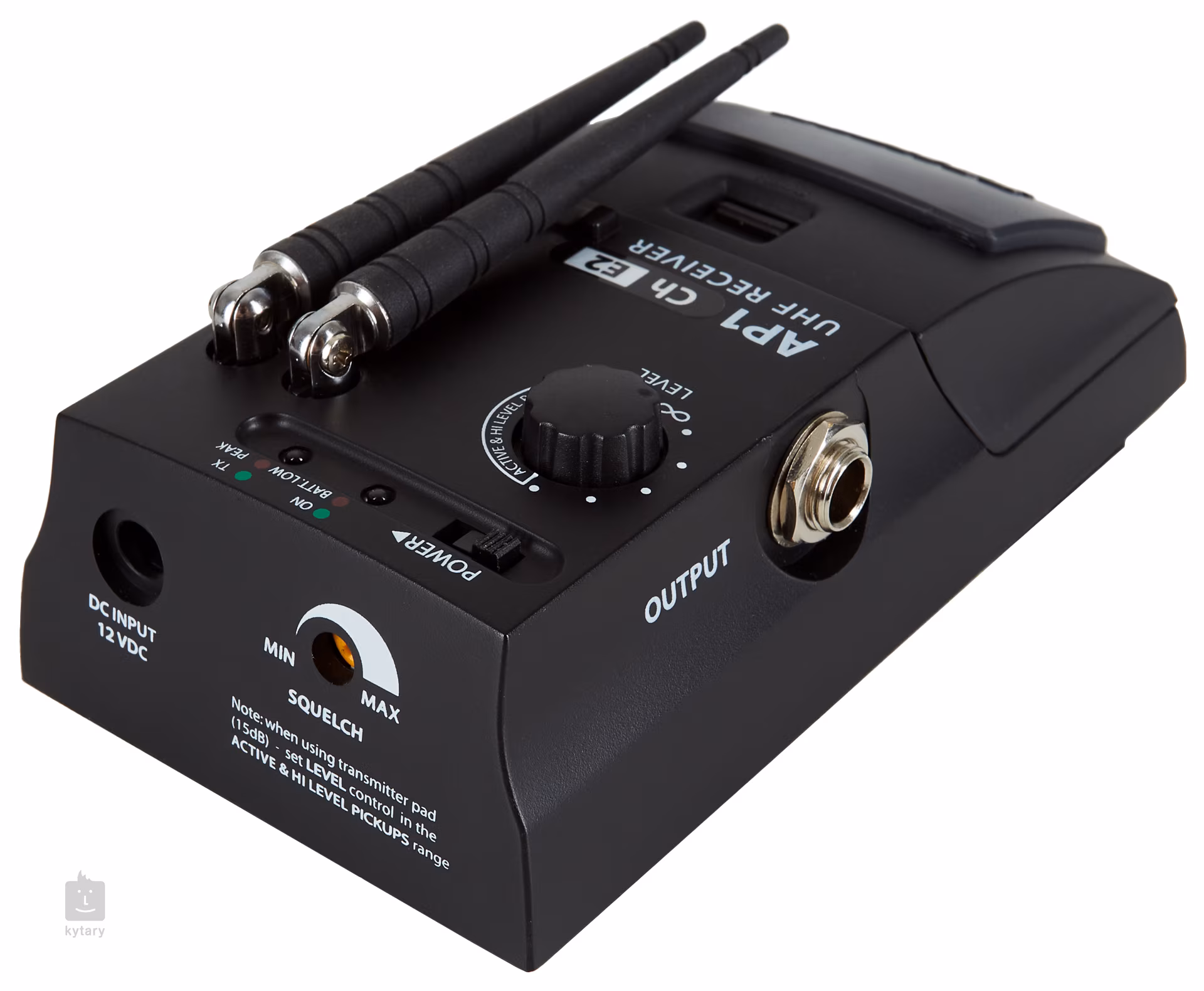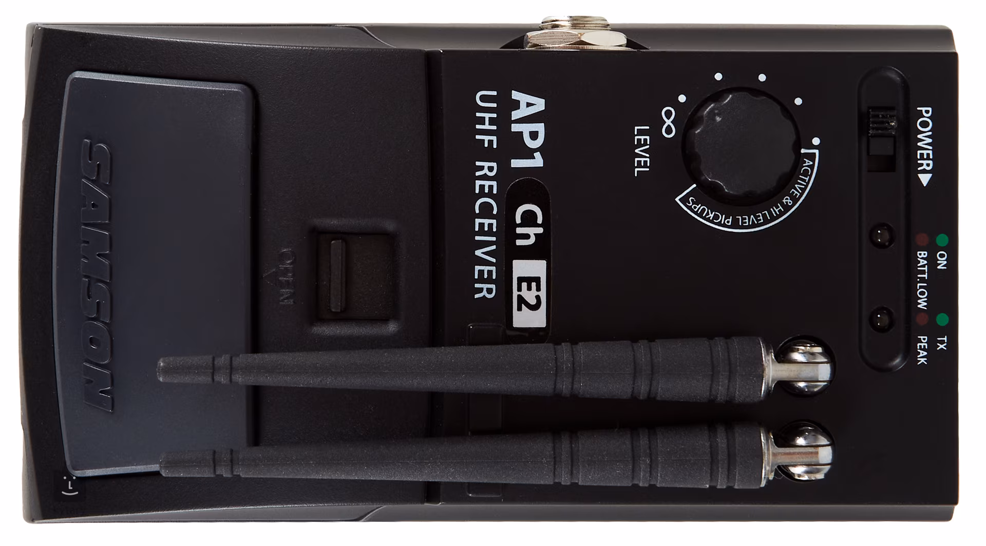 Der AP 1 Pedal-Effekt-Empfänger hat zwei abnehmbare Antennen und passt mit seiner Größe nahtlos in jedes Pedalboard. Mit dem Lautstärkeregler wird das Ausgangssignal reguliert, und separate LEDs zeigen den Übersteuerungs- und Batteriestatus an. Die Stromversorgung erfolgt über eine 9-V-Batterie oder einen optionalen Adapter.