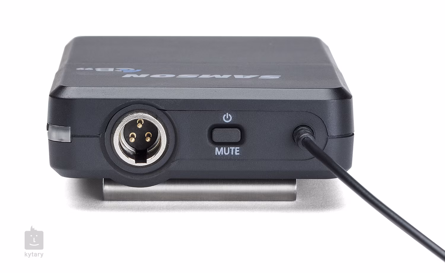Der CB99 Sender verfügt über einen verriegelbaren Mini-XLR-Anschluss und eine Mute-Taste auf der Oberseite. Auf der Rückseite befindet sich ein robuster Metall-Gürtelclip. Der gesamte Sender wird mit zwei AA-Batterien betrieben, die bis zu acht Stunden Betriebszeit ermöglichen. Im Inneren des Batteriegehäuses befindet sich ein Gain-Regler, mit dem sich die Lautstärke des Signals verändern lässt.