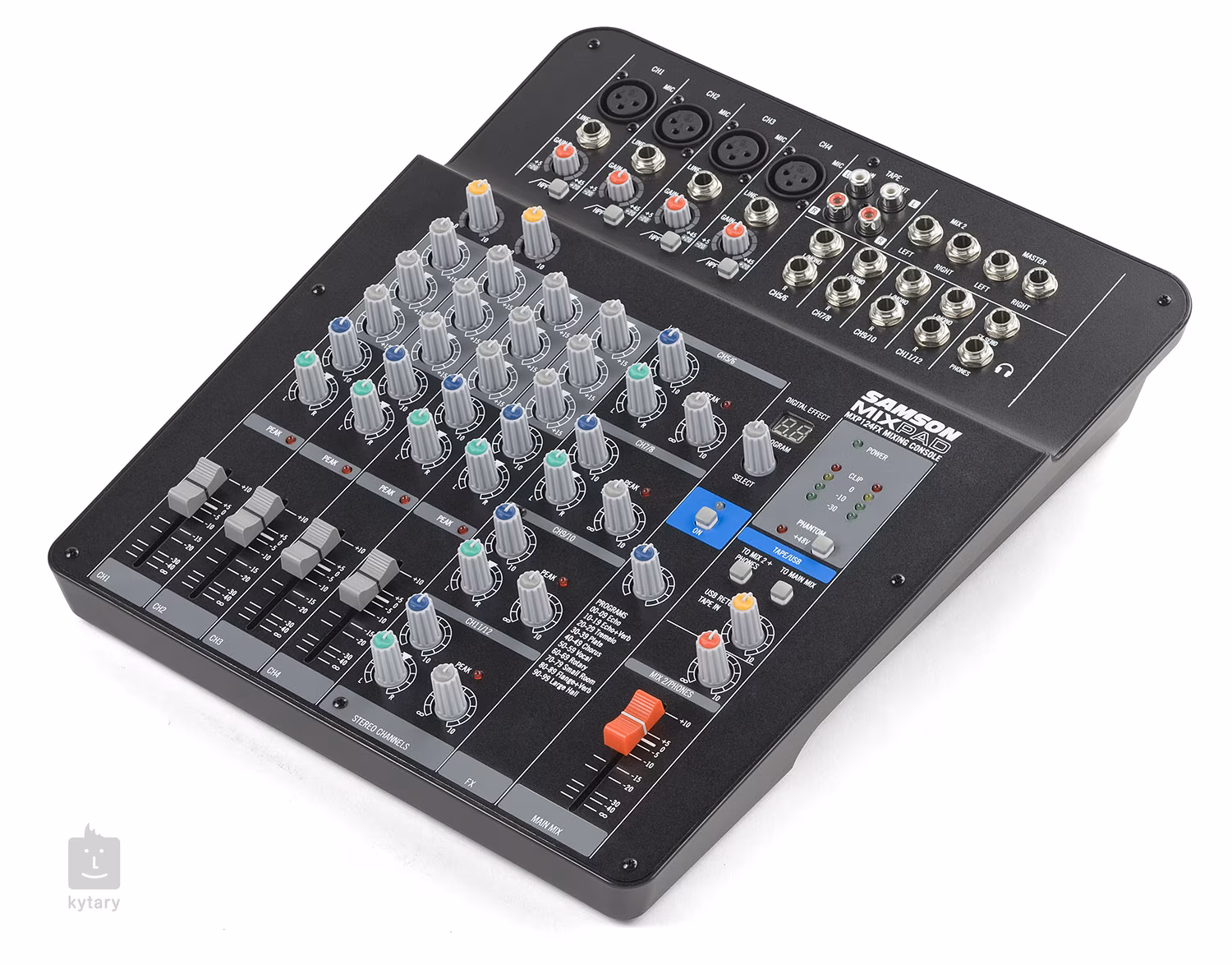 Kompaktes 12-Kanal-Stereo-Mischpult mit Effekten und USB für Studio- und Live-Anwendungen.4 x MDR-Mikrofonvorverstärker der Klasse A (maximaler Dynamikbereich) mit extrem geringem Rauschen und 3-Band-EQ.4 Stereokanäle. Hochwertige und präzise Fader. 3-Band-EQ (Bässe, Mitten, Höhen) und MUTE-Funktion auf jedem Monokanal, für einen einfachen Gesangssound sind die Monokanäle mit Gain-Regler und HPF-Filter ausgestattet. Die ersten beiden Monokanäle sind mit einem Kompressor ausgestattet. Ausstattung der Stereokanäle: Balance-Regler und Übersteuerungsanzeige. Auxiliary-Eingänge mit RCA-Anschlüssen für den MP3-Anschluss, Auxiliary-Ausgänge mit RCA-Anschlüssen für die Aufnahme. Monitor-Send-Signalausgang auf jedem Kanal. Kopfhörerausgang mit Lautstärkeregler. Overdrive-Anzeigen und Mute-Tasten auf allen Kanälen. 4-Segment-VU-Anzeige. Phantomspeisung. USB-Schnittstelle. Effekte: 100 rauscharme 24-Bit-Effekte.