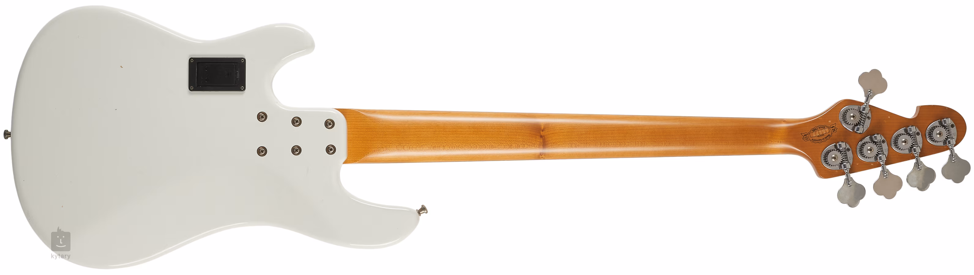 Der Olivenholz-Korpus des Basses California Central 5 SAVW EFB MH R ist mit einer farbigen Lackierung in Virgin White und einem Finish mit sehr dezenten Elementen künstlicher Patina verziert. Der Ahornhals mit komfortablem „C”-Profil ist mit einem Ebenholzgriffbrett mit 22 Bünden versehen. Der Hals ist mit sechs Schrauben am Korpus befestigt, die Orientierung auf dem Griffbrett erleichtern Perlmutt-Positionsmarkierungen (Abalone).