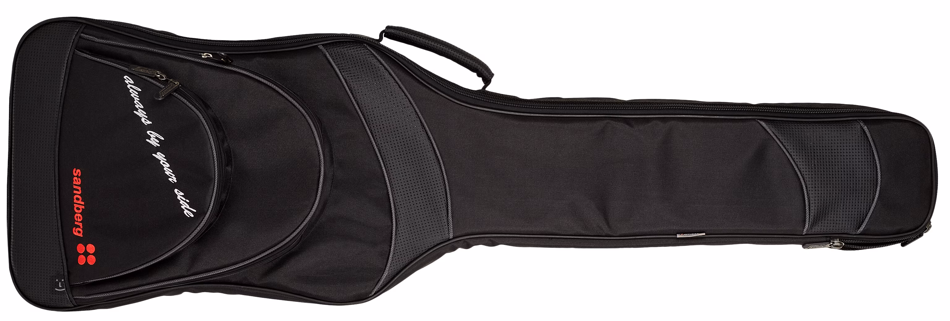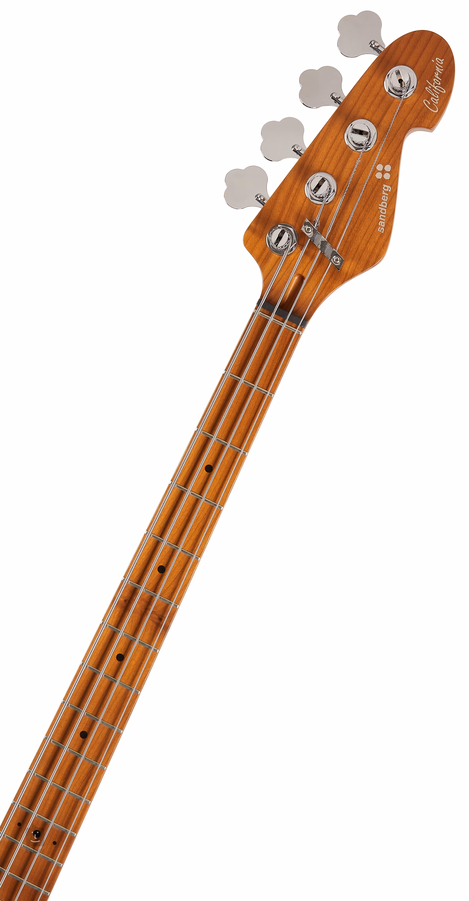 Das Griffbrett ist typischerweise massiv mit separaten Steinen und bietet neben einer guten Schwingungsübertragung z. B. die Möglichkeit, den Saitenabstand im Bereich von 18,5-20 mm einzustellen. Auf der anderen Seite der Gitarre finden wir Sandberg-Stimmmechaniken.