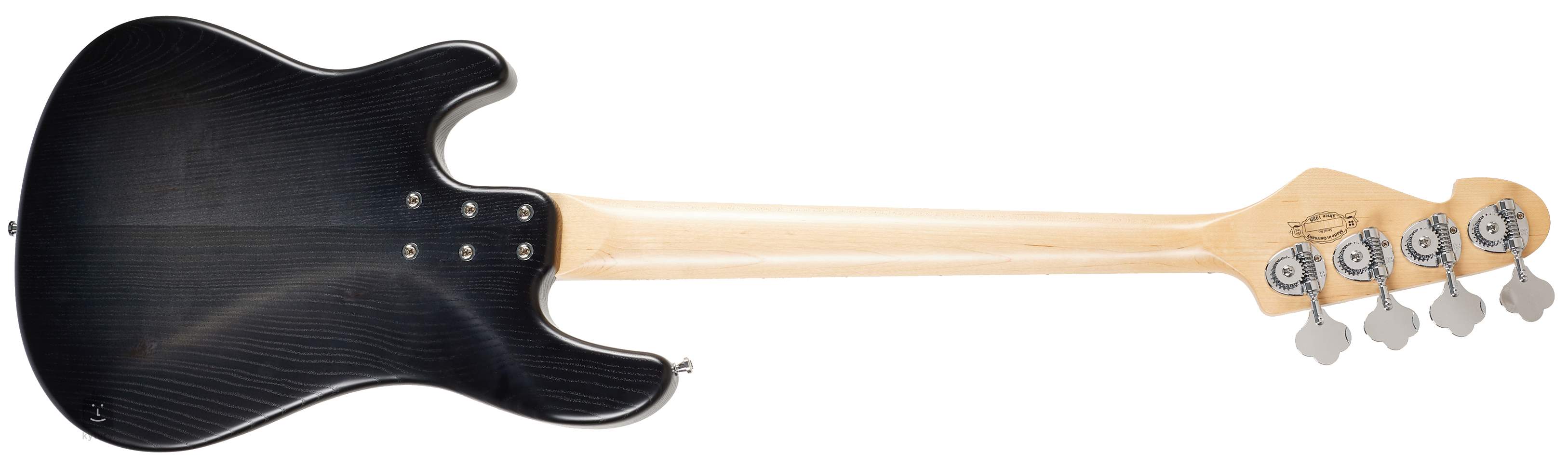 Der Korpus dieses Basses ist aus europäischer Esche gefertigt, der Hals aus kanadischem Ahorn. Er ist mit sechs Schrauben verschraubt, die ihn in einer absolut präzisen Position halten. Das Griffbrett ist aus Ahorn und hat 22 Bünde. Es handelt sich um ein Shortscale-Instrument, dessen Mensur 762 Millimeter beträgt.