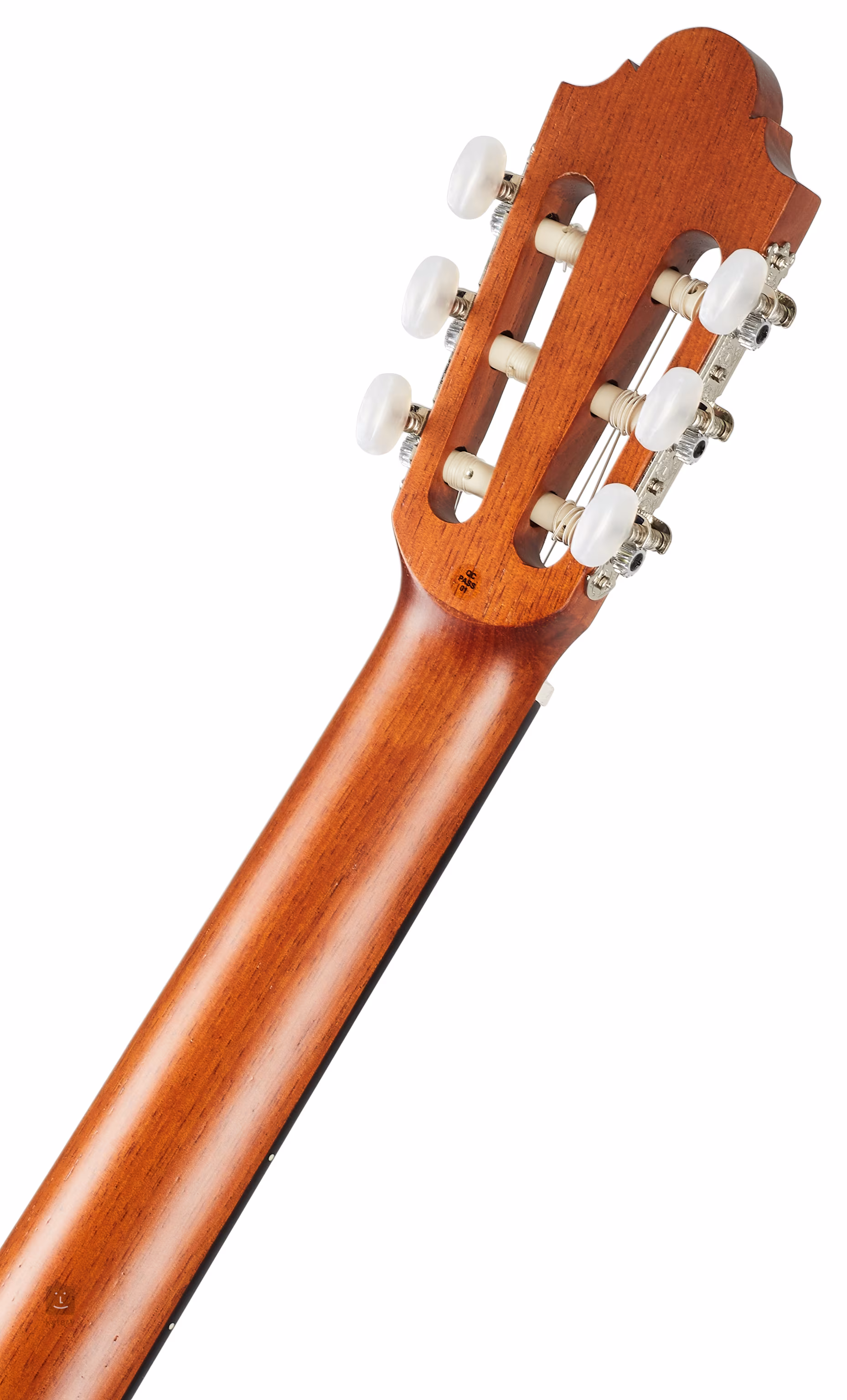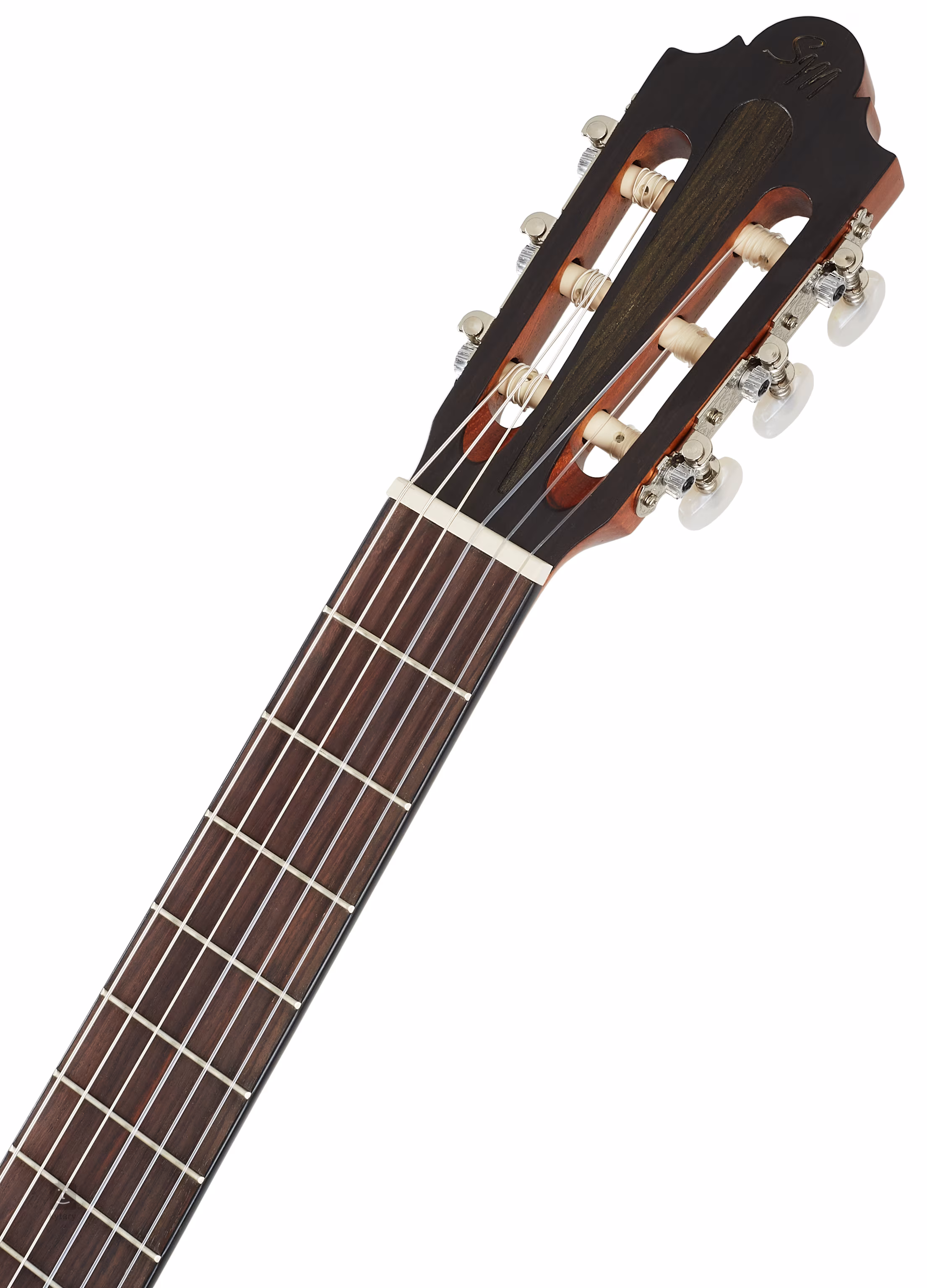 Das Modell Estudio Classic bietet eine semi-massive Korpuskonstruktion, die aus massiver Fichtenfront und -zargen und einem Boden aus Sperrholz besteht. Die Saiten sind in einer klassischen, offenen Chrom-Mechanik mit Perlmutt-Imitat-Stimmwirbeln verankert. Das stilvolle Aussehen des Instruments wird durch die dekorative Rosette und die doppelseitige Korpuseinfassung unterstrichen.