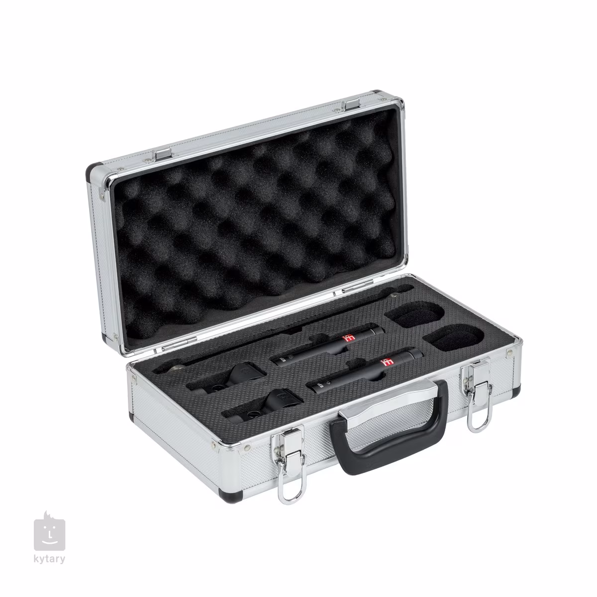 Ein Stereo-Aufnahmekit mit 2 sE8-Mikrofonen, 2 Halterungen, einer Stereohalterung, 2 Windschutzhüllen und einer tragbaren Metalltasche.