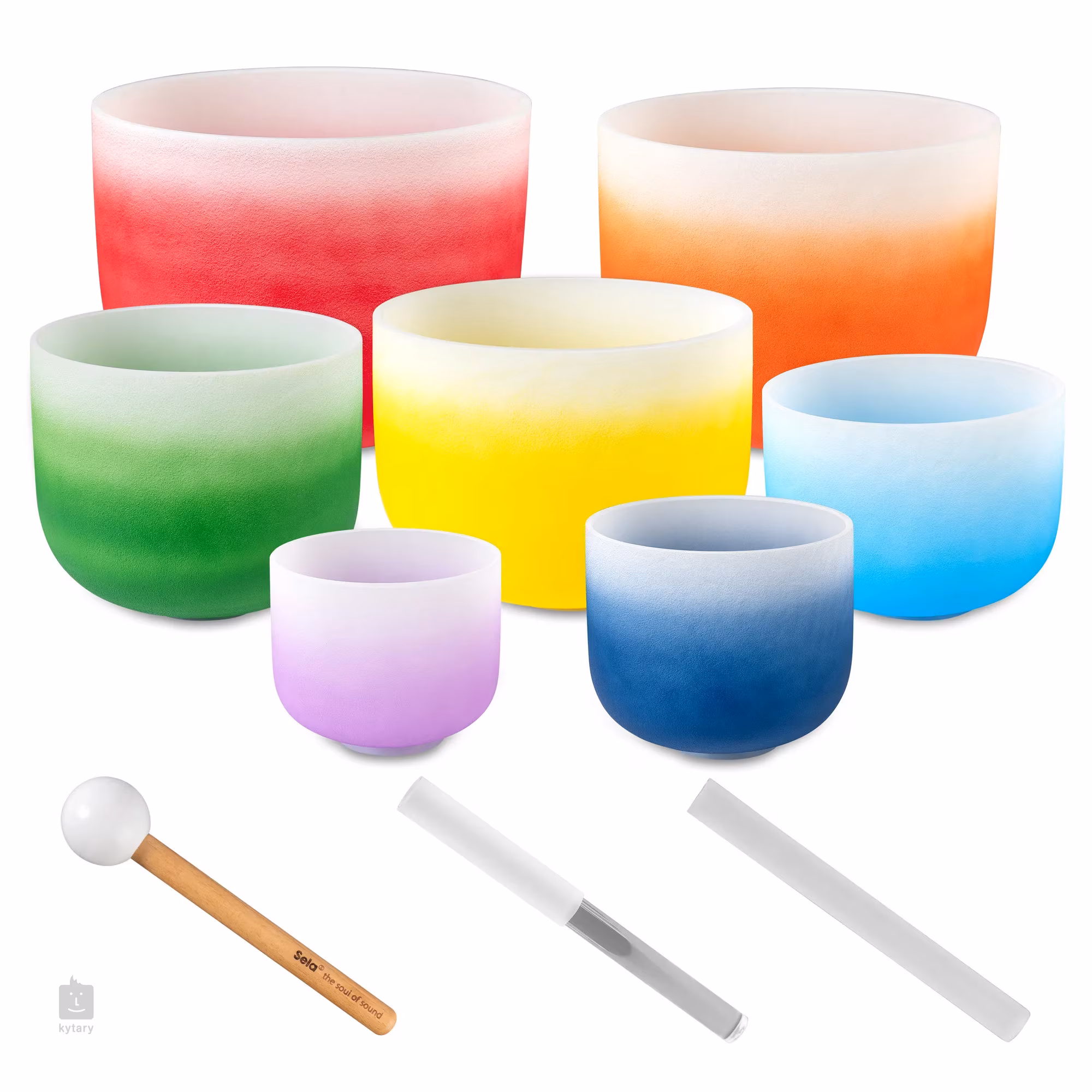 Jede Schale ist nicht nur farblich, sondern auch klanglich mit einem der Energiepunkte verbunden - von der Wurzel bis zum Kronenchakra. Die größte Schale, 14″ (ca. 36 cm) im Durchmesser, ist auf den Ton C4 gestimmt und wird dem Wurzelchakra zugeordnet. Die kleinste, 8″ (ca. 20 cm), repräsentiert das Kronenchakra und ist auf den Ton B4 gestimmt. Die anderen Schalen decken die Töne D4, E4, F4, G4 und A4 ab, wobei jede ihren eigenen Farbton hat, der dem jeweiligen Chakra entspricht.