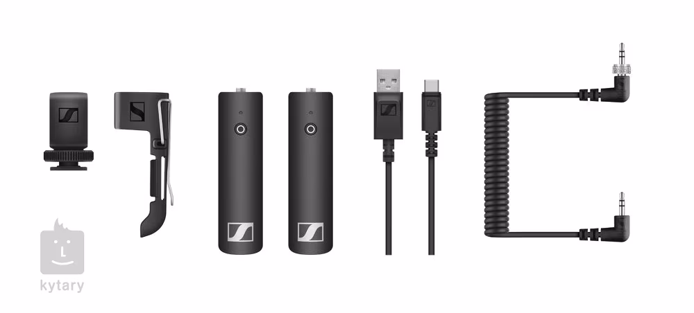 Im Lieferumfang enthalten sind ein EK XSw-D(3.5) Empfänger, SKP XSw-D(3.5) Sender, Clip, Kamerahalterung, Audiokabel und USB-Kabel.