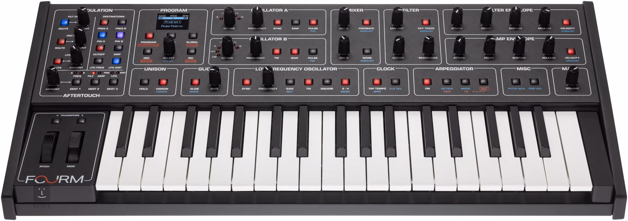 Der Sequential Fourm ist ein kompakter analoger Synthesizer, der die legendäre Klangarchitektur des Prophet-5 mit moderner Ausdruckskraft und intuitiven Bedienelementen verbindet. Er verfügt über vier vollständig analoge Stimmen mit einem Oszillatorpaar pro Stimme, simultaner Wellenformauswahl und einem klassischen vierpoligen resonanten Tiefpassfilter mit Basskompensationsfunktion für einen dichten und ausgewogenen Klang über das gesamte Spektrum.
