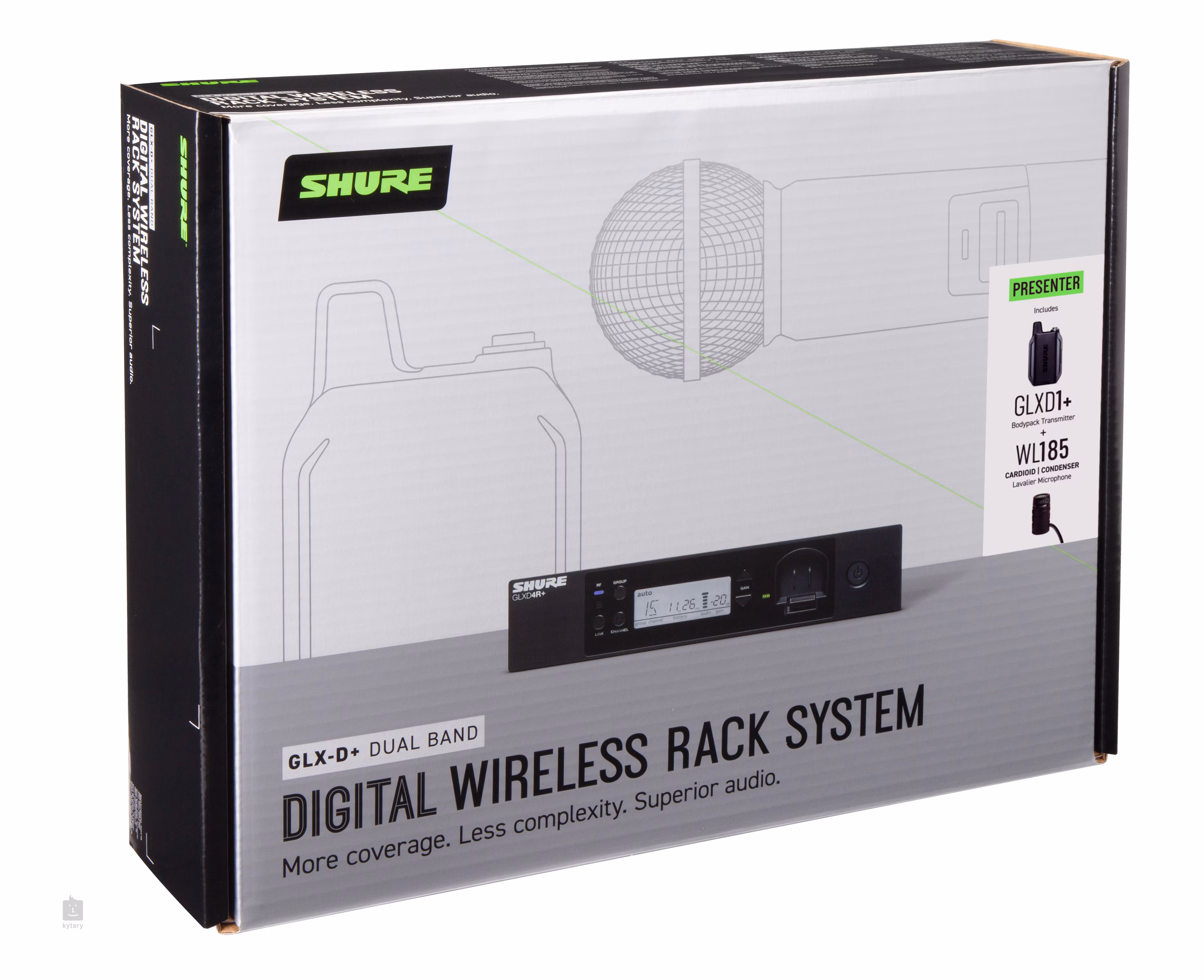 Das drahtlose GLXD14R+ LAVALIER SYSTEM MIT WL185 besteht aus dem Premium-Ansteckmikrofon WL185, dem Taschensender GLXD1+ und dem Rackmount-Empfänger GLXD4R+. Das Paket enthält ein Netzteil, einen SB904 Lithium-Ionen-Akku, Rack-Hardware und eine Vinyltasche mit Reißverschluss.