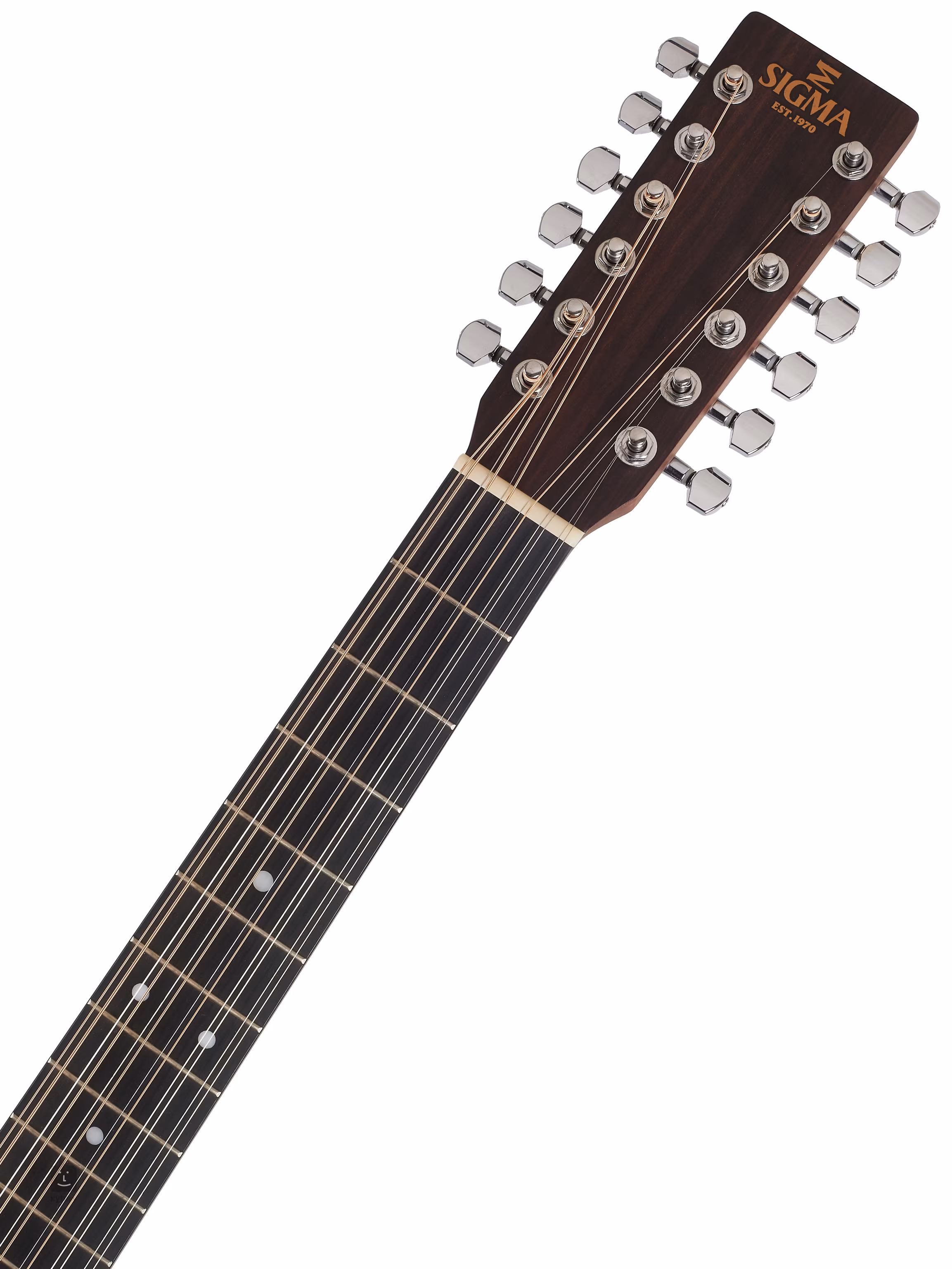 Die Vorderseite dieser 12-saitigen Gitarre ist aus massiver Sitka-Fichte gefertigt, während die Zargen und der Boden aus Mahagoni bestehen. Am Mahagoni-Hals, der am vierzehnten Bund mit dem Korpus verbunden ist, befindet sich ein Griffbrett aus Micarta-Verbundmaterial mit zwanzig Bünden.