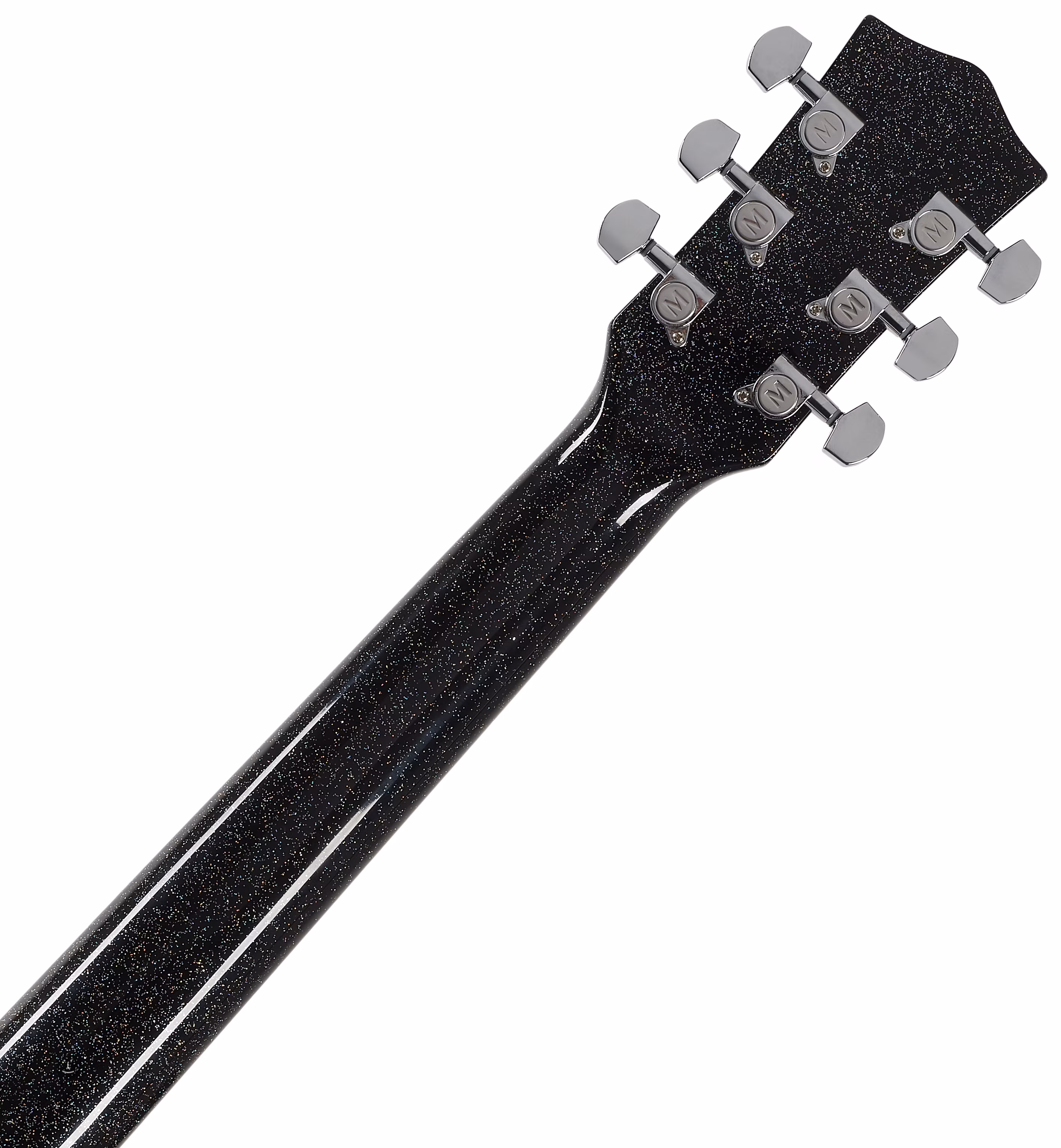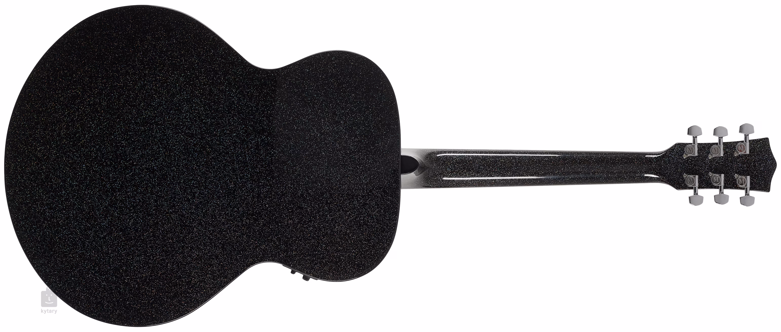 Die Vorderseite der Gitarre besteht aus massiver Sitka-Fichte, während der Boden und die Zargen aus laminiertem Mahagoni gefertigt sind. Der Korpus ist mit einer dünnen Schicht Glanzlack und Metallic Flake Black Finish verziert. Der Mahagoni-Hals, der am vierzehnten Bund durch eine Schwalbenschwanzverbindung mit dem Korpus verbunden ist, ist mit einem Micarta-Verbundgriffbrett mit zwanzig Bünden ausgestattet. Die Saiten sind in einer verchromten Druckgussmechanik und einer Gibson-Kopfplatte aus Verbundwerkstoff im "Schnurrbart"-Design montiert. Der Nullbund und der kompensierte Knochensattel garantieren eine ideale Schwingungsübertragung der Saiten. Das stilvolle Design des Instruments wird durch das schwarze Perimeter-Binding und das Firmenlogo auf der Kopfplatte akzentuiert.