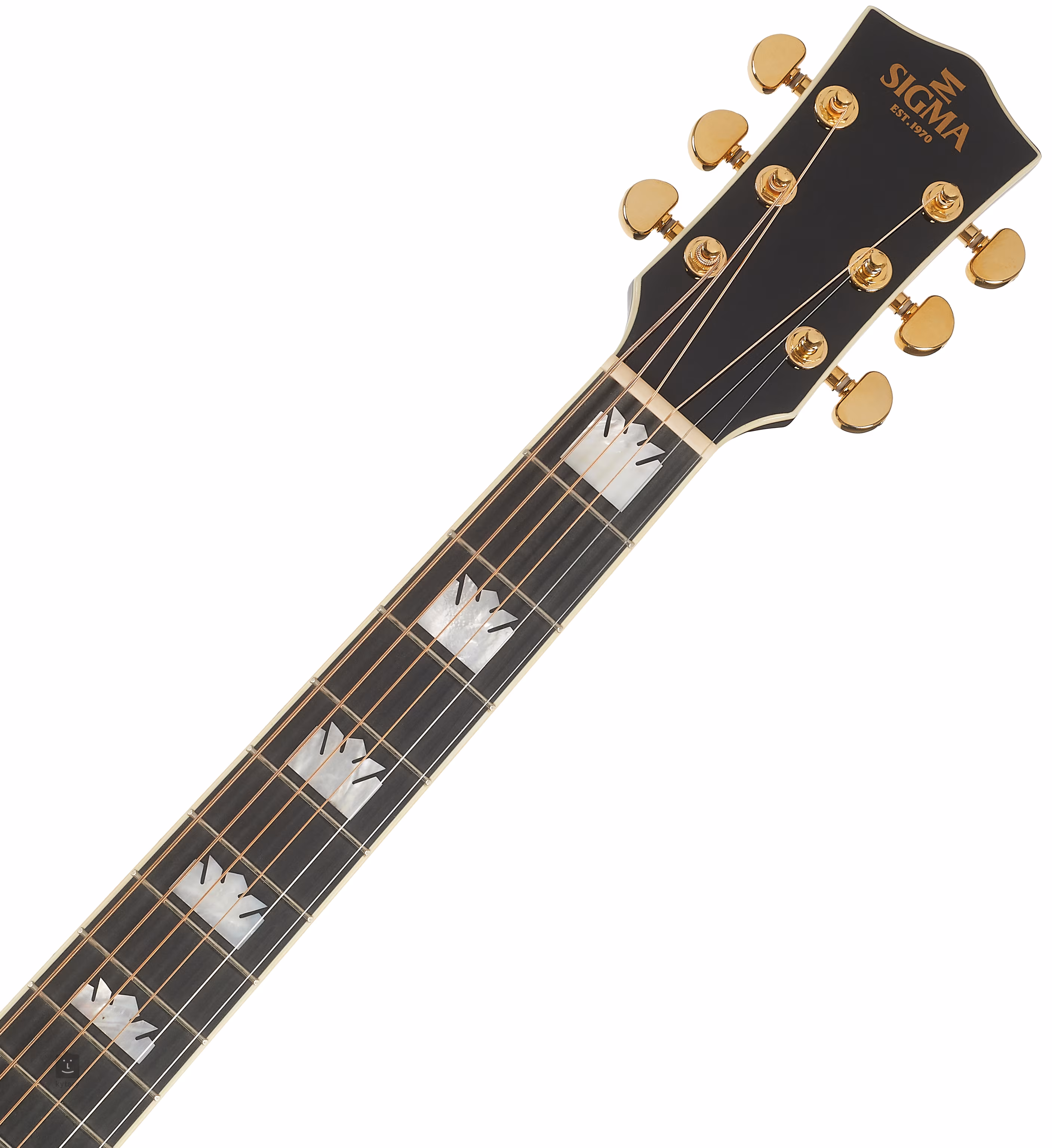 Die Saiten sind in Gotoh Die-Cast Mechaniken in Gold-Finish und einer Micarta Kopfplatte montiert. Der Nullbund und der kompensierte Knochensattel garantieren eine ideale Schwingungsübertragung der Saiten. Das stilvolle Aussehen der Gitarre wird durch die glänzende Lackdecke, das mit grafischen Motiven verzierte Schlagbrett, das von den Gibson SJ-200 Modellen bekannt ist, das weiße Korpusbinding, das durch schwarze Linien ergänzt wird, die Verzierung der Bodenplatte und das Logo auf der Kopfplatte unterstrichen.