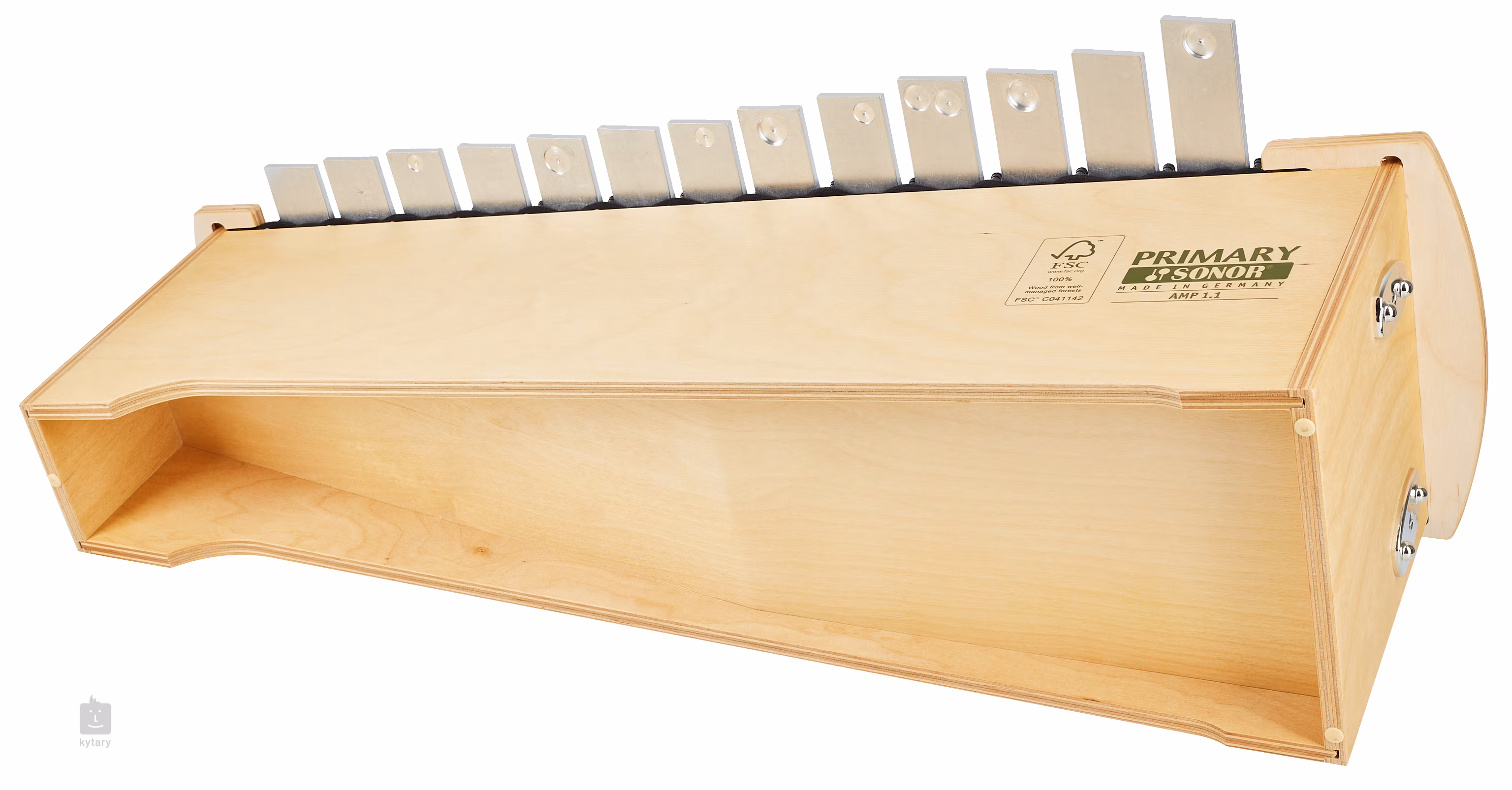 Dieses Altmetallophon ist aus Birkensperrholz gefertigt und mit Metallpolstern versehen.