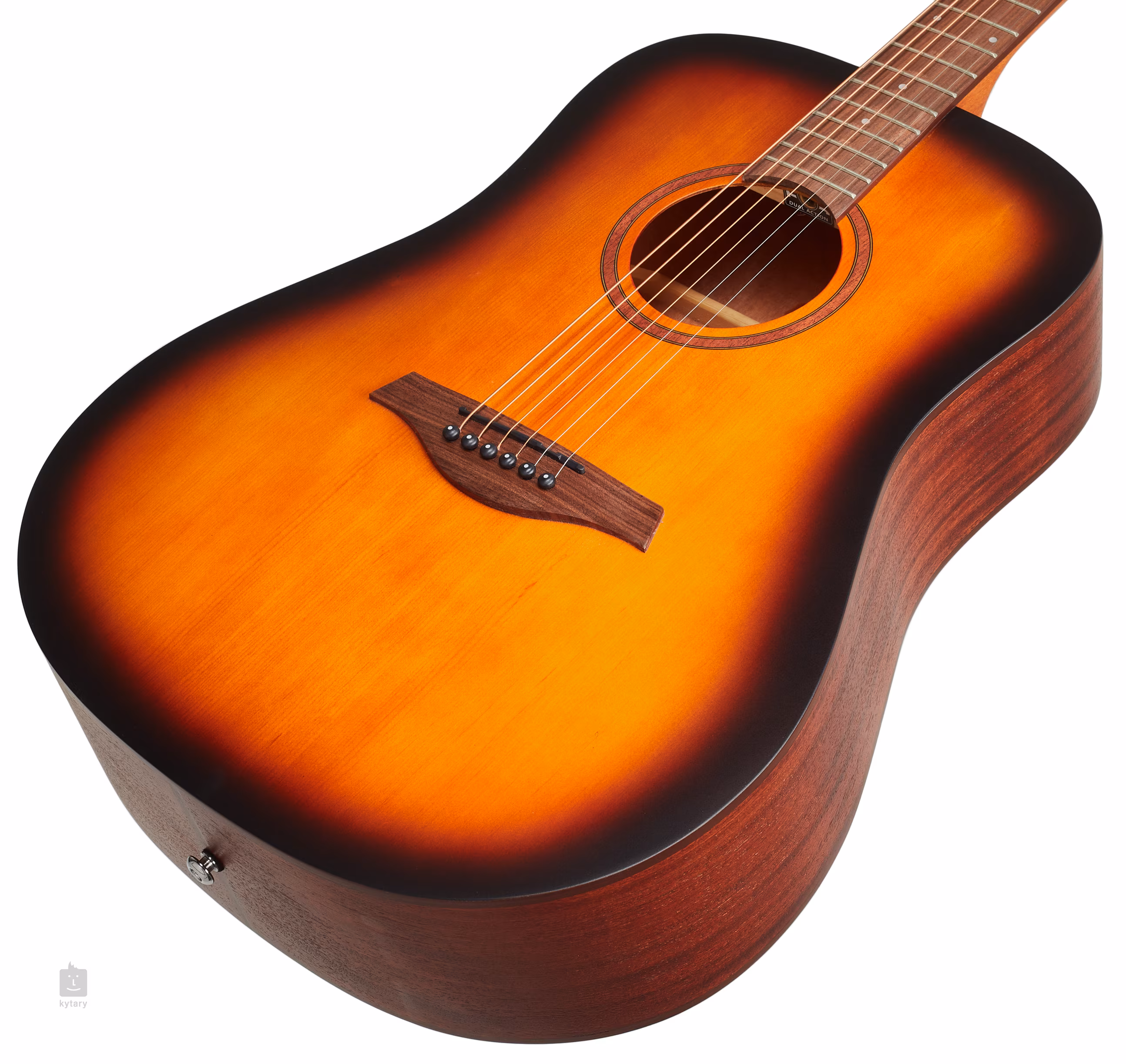 Die CODY DN-SBT Akustikgitarre hat eine Fichtendecke aus Sperrholz, Boden und Zargen aus Sperrholz, einen Okoumé-Hals mit einem angenehmen C-Profil, ein Walnuss-Griffbrett mit zwanzig Bünden, verchromte Druckguss-Mechaniken und eine offenporige Sunburst-Satinierung.