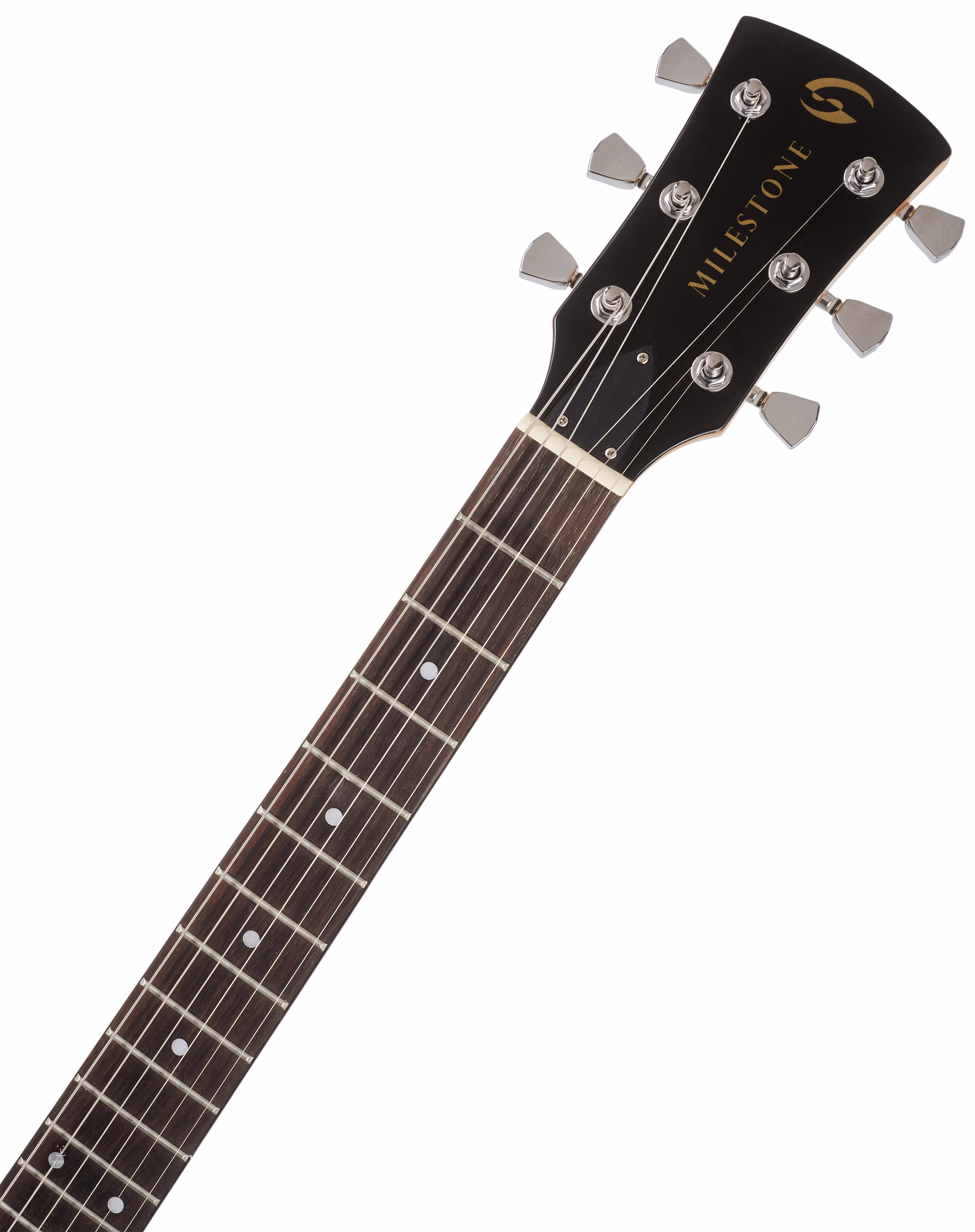 Die erschwinglichen Soundsation MILESTONE E-Gitarren im traditionellen Single-Cut LP-Design sind für Einsteiger geeignet. Konkret bieten die MILESTONE-ST Flat-Top-Modelle die üblichen Features von Single-Cut-LP-Modellen in Form von zwei Humbuckern, separaten Lautstärke- und Tonreglern, einem dreistufigen Pickup-Schalter, einer Vintage-Style-Stimmmechanik sowie einem massiven Hals und Halsstab.