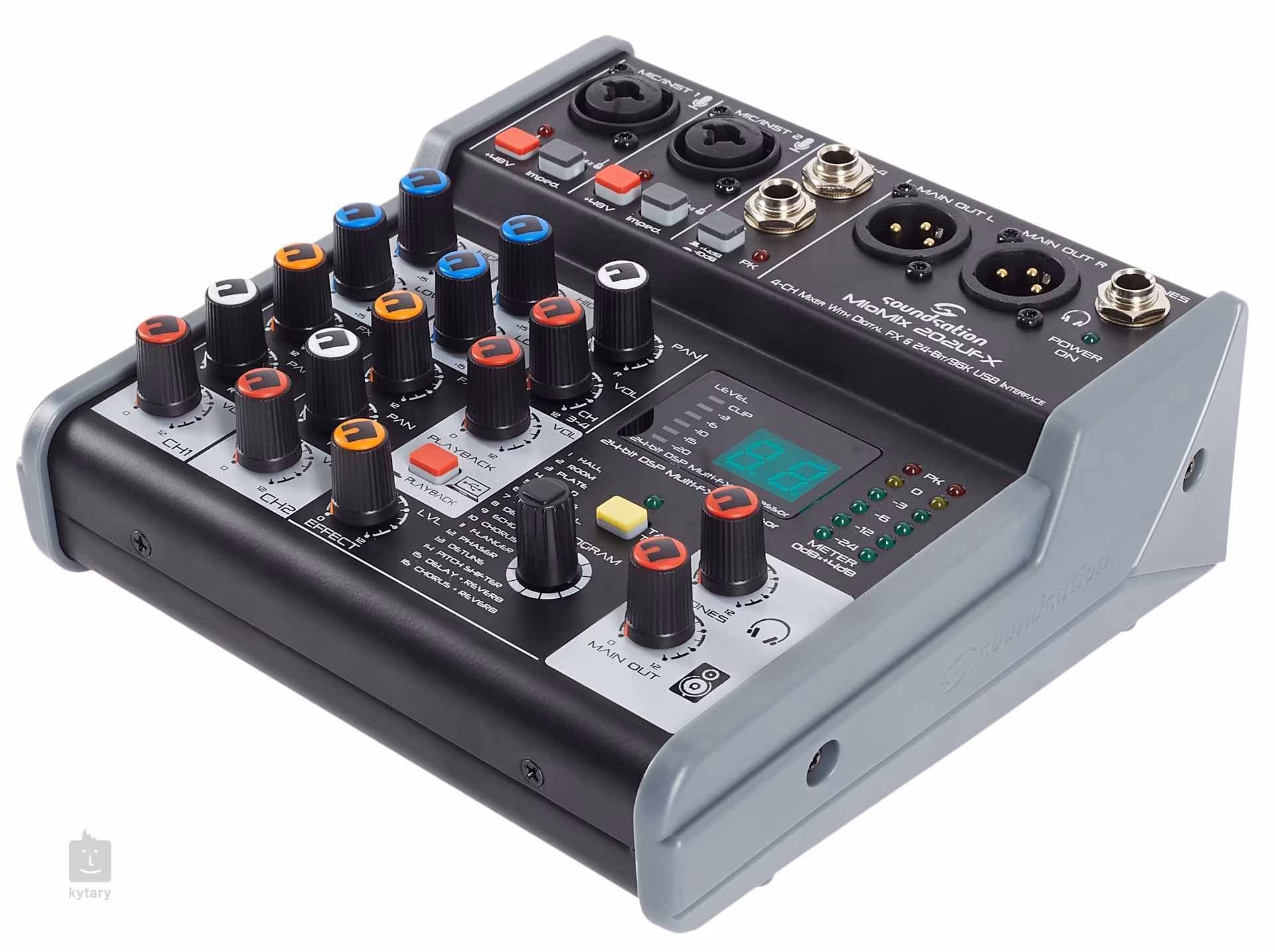 Miomix 202UFX ist ein Vierkanal-Mischpult mit zwei kombinierten XLR/TRS-Eingängen (hier können Sie Mikrofone, elektrische Instrumente oder Line-Signale anschließen), zwei Line-Eingängen, zwei XLR-Ausgängen zur PA und einem Kopfhörerausgang für detailliertes Monitoring. Sie können jeden Kanal mit einem Zweiband-EQ anpassen, das Panorama einstellen und auch ein Signal von der FX-Einheit hinzumischen. Für Kondensatormikrofone gibt es Phantomspeisung. Über die sechsstufige LED-Anzeige und das hintergrundbeleuchtete Display behalten Sie den Überblick über Ihr Setup.
