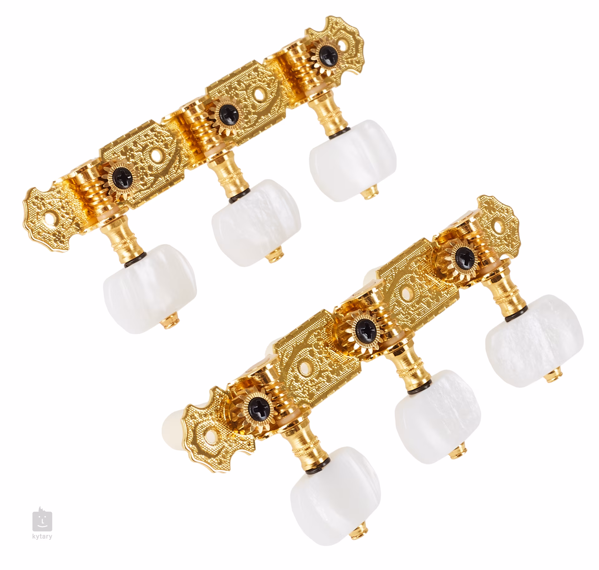 Satz vergoldeter Stimmmechaniken für klassische Gitarre. Der Stiftabstand beträgt 35 mm und der Durchmesser 10 mm.