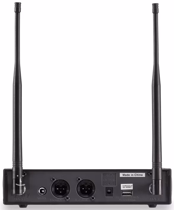 Der Empfänger ist benutzerfreundlich und sein Bedienfeld ist in zwei Bereiche für jedes Mikrofon unterteilt. Jede Sektion ist mit einem TFT-Farbdisplay und einem Multifunktionsknopf zur Steuerung aller Funktionen und Parameter ausgestattet. Auf der Rückseite befinden sich zwei XLR-Ausgänge und ein Line-Ausgang für das Mischpult. Der Empfänger wird über einen mitgelieferten 12V-Adapter mit Strom versorgt. Im Lieferumfang enthalten sind also der Empfänger, zwei Handmikrofone, ein Netzteil, wiederaufladbare Batterien und eine Tragetasche.