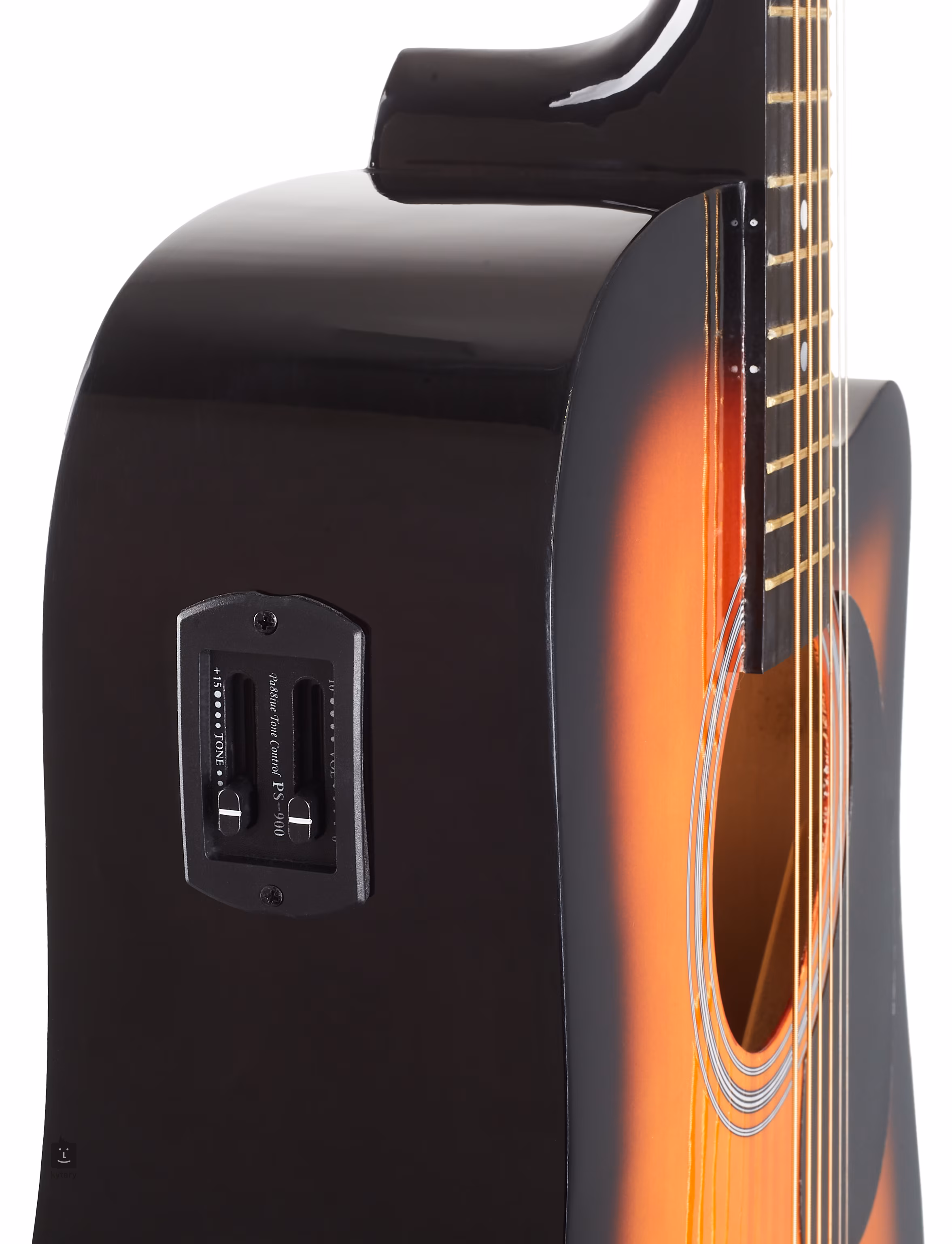 Zu den Optionen für die Klangverstärkung gehört ein Vorverstärker mit Lautstärke- und EQ-Reglern, die in die Rückseite der Gitarre integriert sind.