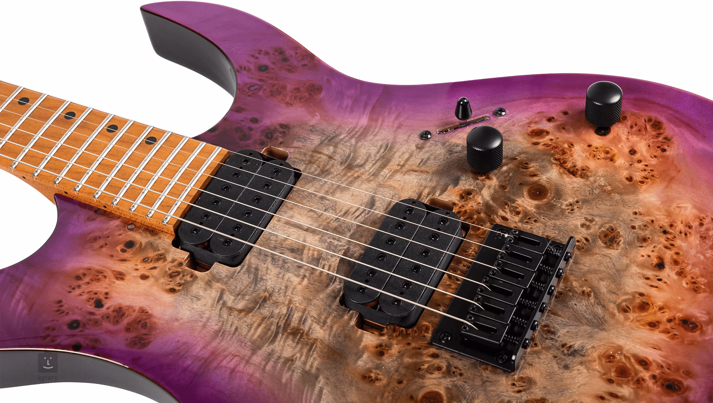 Der Pappelkorpus der Spira Guitars S-450 TPP E-Gitarre ist mit einer geflammten Ahorndecke furniert und in Transparent Purple lackiert. Auf den Hals aus kanadischem Ahorn mit einem "Modern D"-Profil ist ein Ahorn-Griffbrett mit vierundzwanzig Jumbo-Bünden geklebt. Die Wärmebehandlung von Korpus, Hals und Griffbrett macht das Holz stabiler.