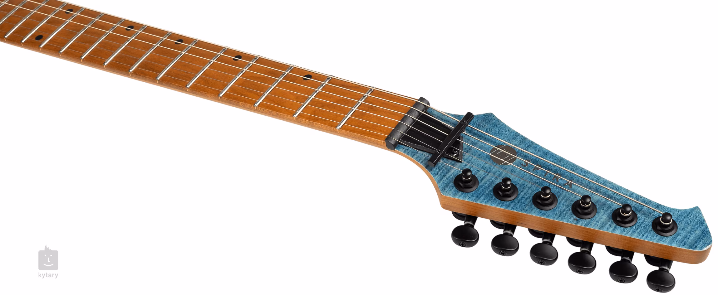 Der Pappelkorpus der Spira Guitars T-450 TDB E-Gitarre ist mit einem geflammten Ahorn-Deckenfurnier und einem Transparent Blue-Finish verziert. Auf den Hals aus kanadischem Ahorn mit einem "Modern D"-Profil ist ein Ahorn-Griffbrett mit vierundzwanzig Jumbo-Bünden geklebt. Die Wärmebehandlung von Korpus, Hals und Griffbrett macht das Holz stabiler.