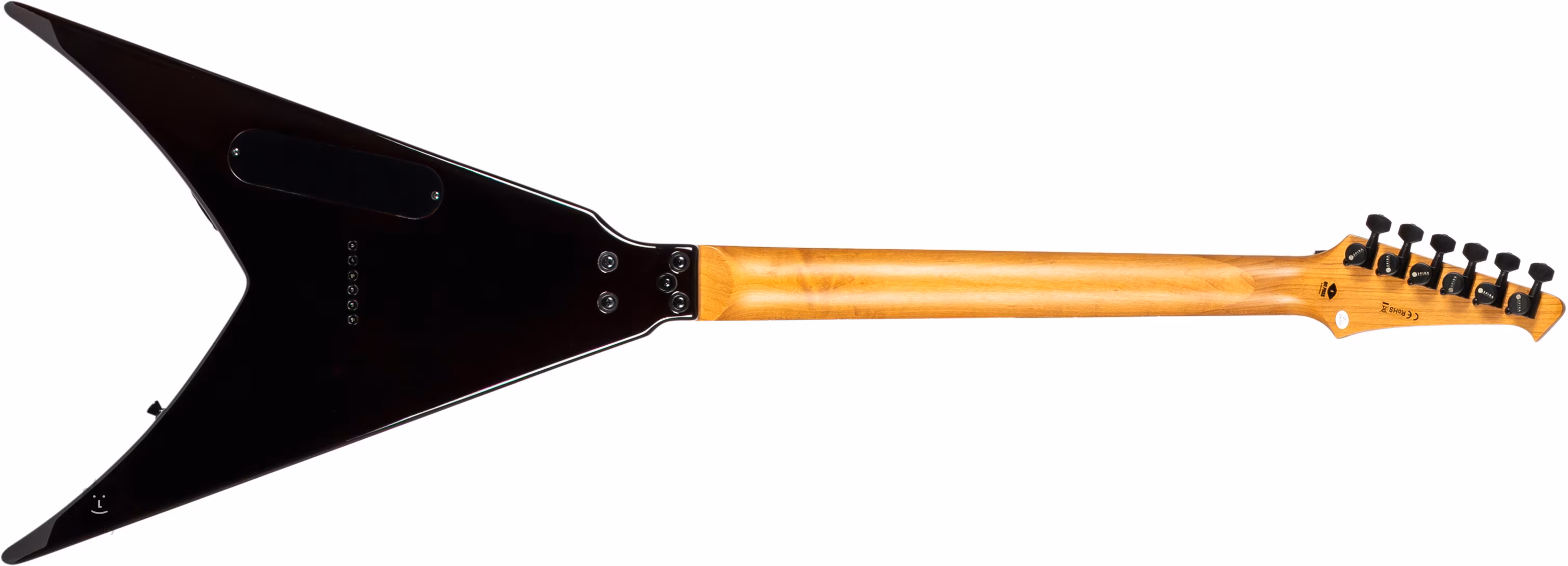 Die E-Gitarre V-500 TPP E ist ein klassisches „V“, d. h. sie basiert auf der Form der Flying-V-Modelle. Der Mahagonikorpus des Instruments ist mit einem Deckenfurnier aus geflammtem Ahorn verziert. Die Maserung des Ahorns wird durch den Hochglanzlack und die Farbgebung „Trans Purple“ hervorgehoben. An den Hals aus kanadischem „geröstetem“ Ahorn (roasted maple) mit „Modern D“-Profil ist ein Griffbrett aus modernem Verbundmaterial im Ebenholz-Design geklebt, das mit vierundzwanzig Jumbo-Bünden besetzt ist.