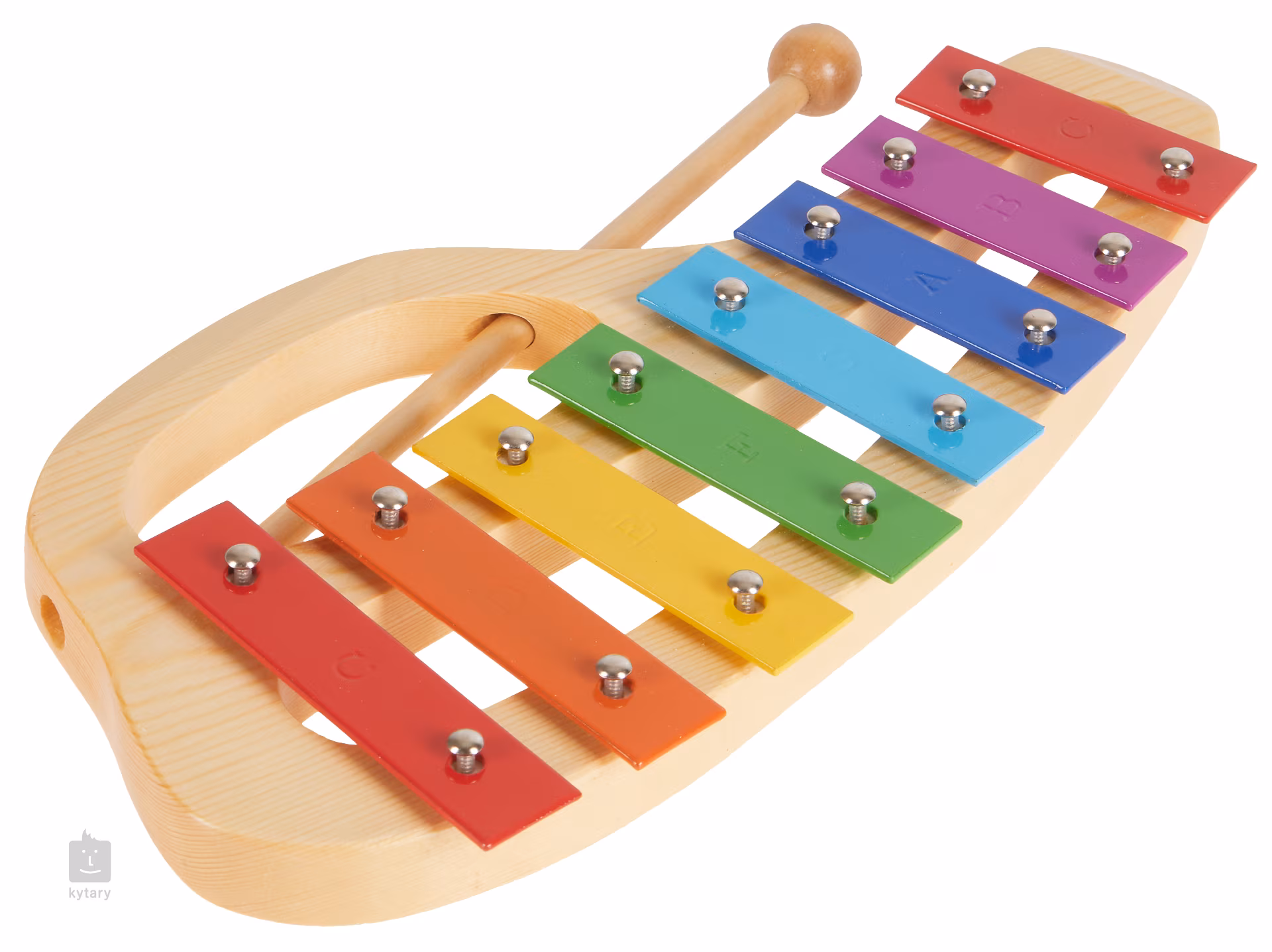 Ovales Metallophon mit acht farbigen Steinen. In attraktiver Verpackung. Dazu gibt es ein Liederbuch für Glockenspiele mit fünf tschechischen Liedern.