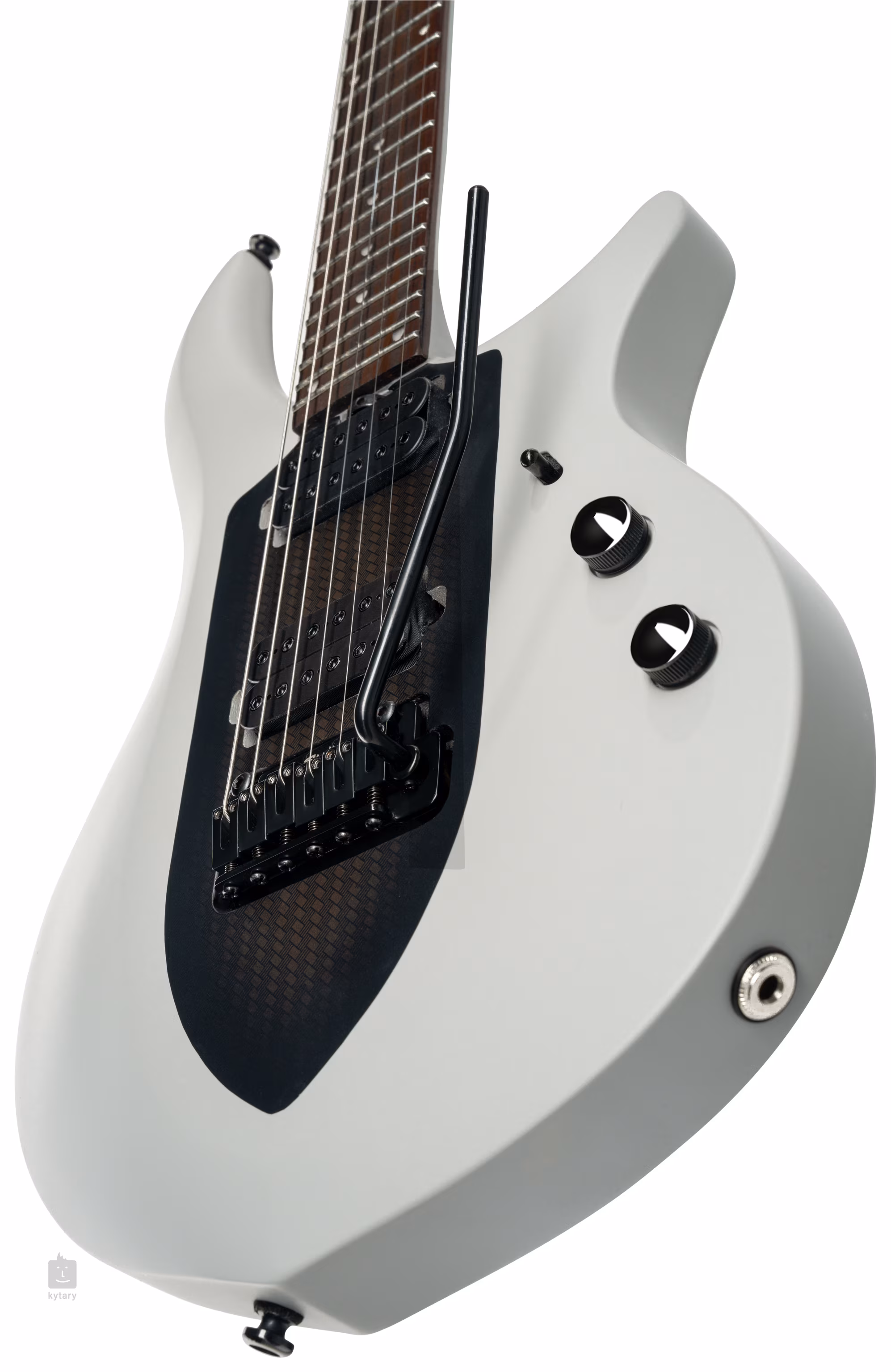 Die Saiten sind in der firmeneigenen Locking-Mechanik und einem modernen Tremolo gelagert. Die schöne Verarbeitung wird durch das Chalk Grey-Finish und die JP Shield-Einlage am ersten Bund akzentuiert.