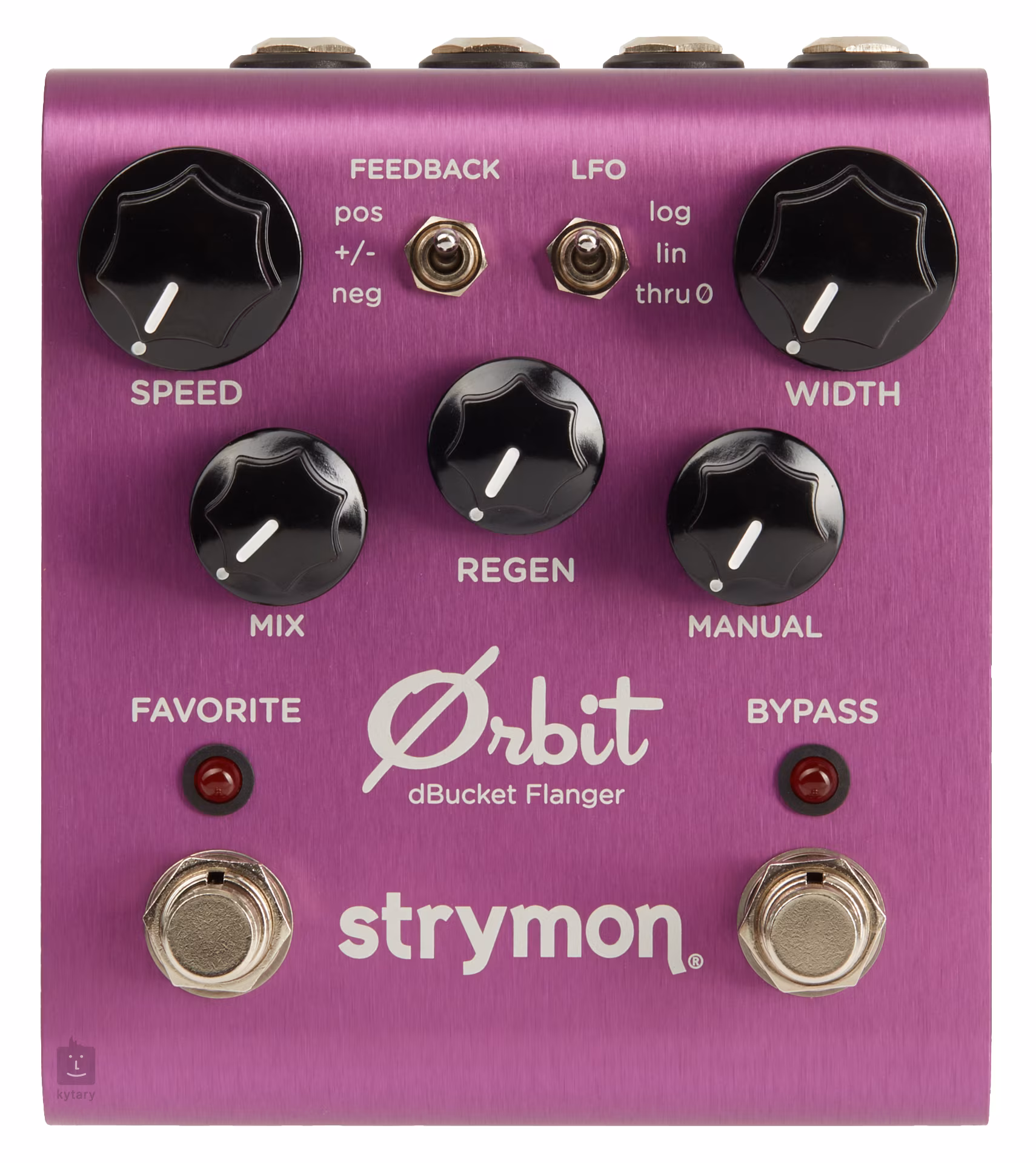 Das Orbit-Pedal ist von den wichtigsten analogen Flangern inspiriert, die in der Rockgeschichte je eine Rolle gespielt haben. Mit diesem Effekt kannst du nicht nur deren charakteristische Sounds erreichen, sondern dank des Thru0-Modus auch neue Möglichkeiten entdecken. Für die Grundeinstellung des Effekts sorgen die Regler Speed, Width, Regen, mit denen die Geschwindigkeit, Breite und Tiefe der Modulation eingestellt wird, sowie Manual, mit dem das Frequenzspektrum angepasst wird. Die Besonderheit des Bedienfelds ist der Mix-Regler, mit dem die Lautstärke des Wet/Dry-Signals eingestellt werden kann, was man bei normalen Flanger-Effekten nicht allzu oft findet. Ein dreistufiger Feedback-Schalter ermöglicht die Wahl zwischen positivem, negativem und einer Kombination aus beidem. Ein weiterer LFO-Schalter dient zur Auswahl zwischen logarithmischen und linearen Oszillatoren, und die dritte Option ist der ungewöhnliche Thru0-Modus, der eine wirklich extreme Signalverarbeitung ermöglicht. Über das optionale Expression-Pedal können Sie jeden Parameter steuern, sobald er aufgezogen ist.