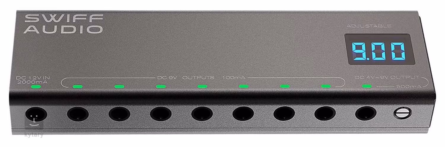 Der Swiff P200 ist ein kompakter Multiadapter, mit dem Sie bis zu acht Gitarreneffekte betreiben und Ihr Handy aufladen können. Er verfügt über sieben vollständig isolierte 9V-Ausgänge (100mA), einen Ausgang mit wählbarer Spannung zwischen 4 und 9V (500mA, ausgestattet mit einem Display, das die gewählte Spannung anzeigt) und einen 5V-Ausgang für USB (1A). Jeder Ausgang verfügt über eine LED-Leuchte, die einen Kurzschluss oder andere Fehlerbedingungen anzeigt. Die gesamte Elektronik ist in einem robusten Aluminiumgehäuse untergebracht. Im Lieferumfang enthalten sind ein Netzteil und ein Satz Verbindungskabel, einschließlich eines Polaritätsumkehrkabels.